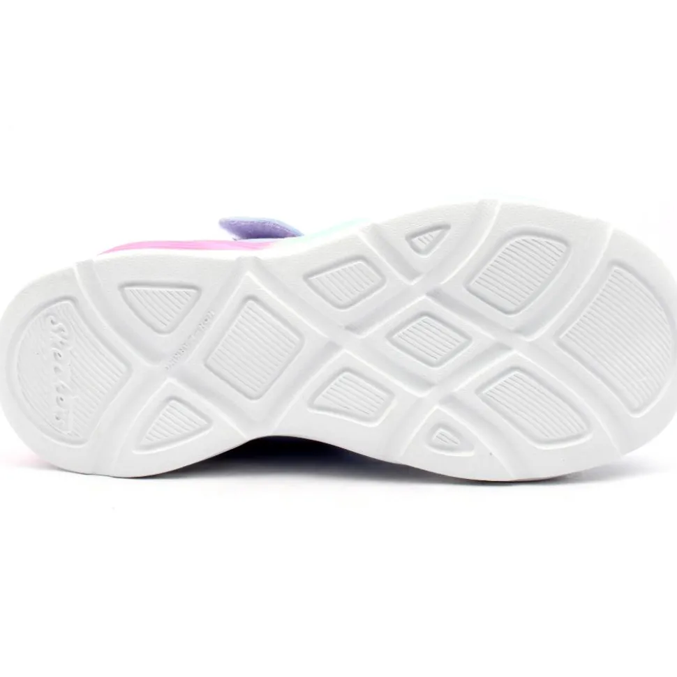 Girls runners from the Skechers kids shoes range with a light up sole. This style has a purple upper with colourful twist deatiling around the lights in the sole. The lights are powered by an on/off button on velcro strap.
