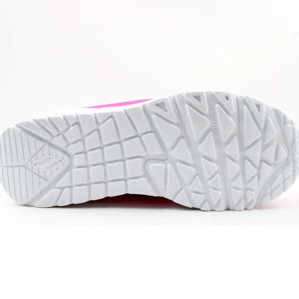 Gorgeous girls runner from the latest Skechers collection. This runner has a durable hot pink upper with a lace closure, the trainer sits upon a chunky white sole. Skechers air-cooled memory foam insoles provide underfoot cushioning ensuring all day comfort.