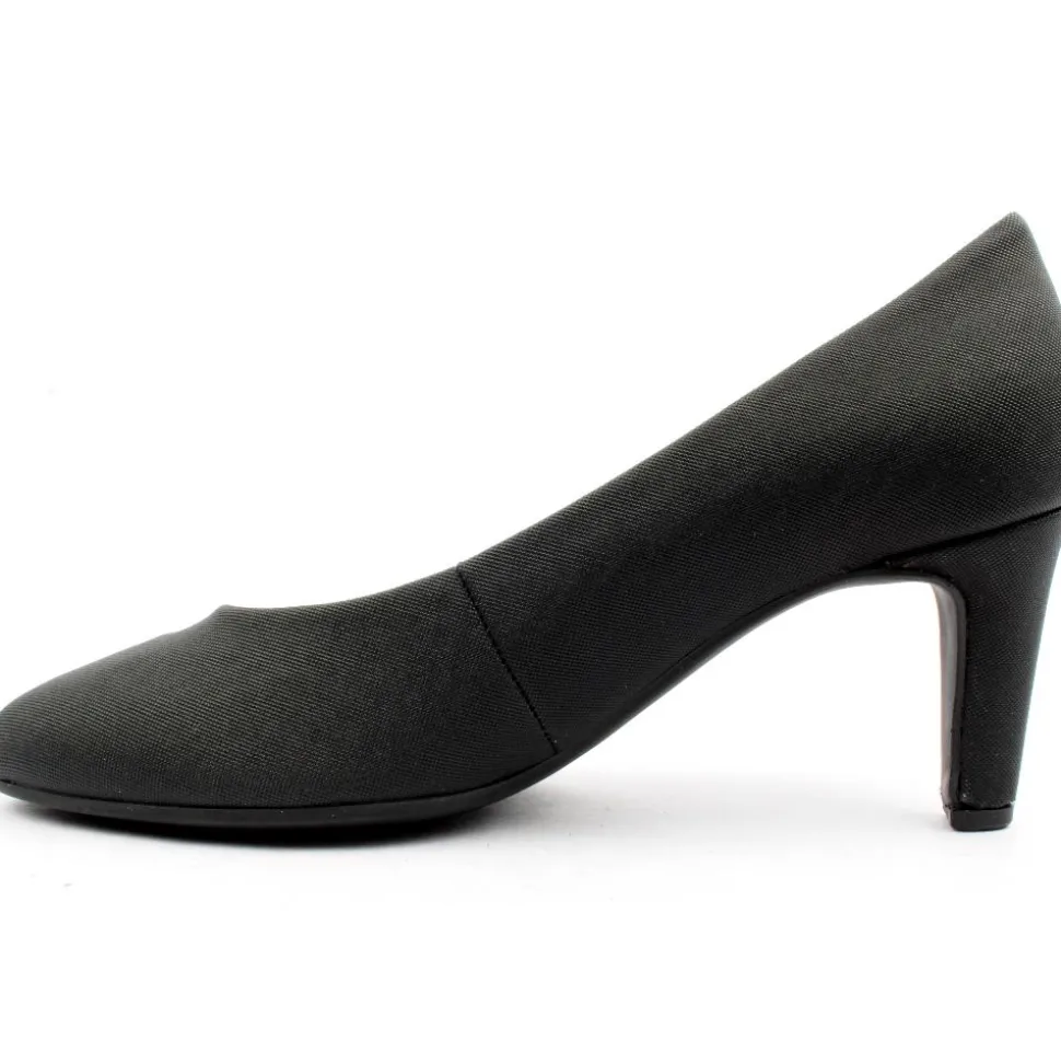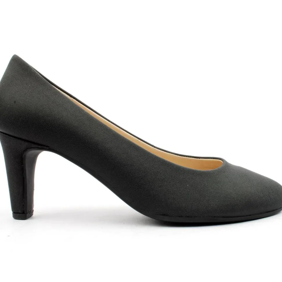 Dressy court shoes from Gabor that effortlessly combines sophistication and style. With a black subtle shimmer effect upper, these shoes add a touch of glamour to any outfit. The slight pointed toe adds a subtle and elegant look, while the medium heel ensures both comfort and stability. They are perfect for those who value both fashion and practicality.