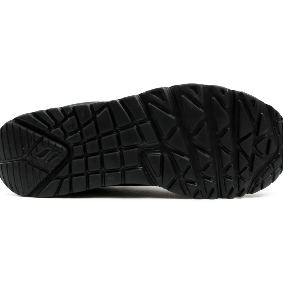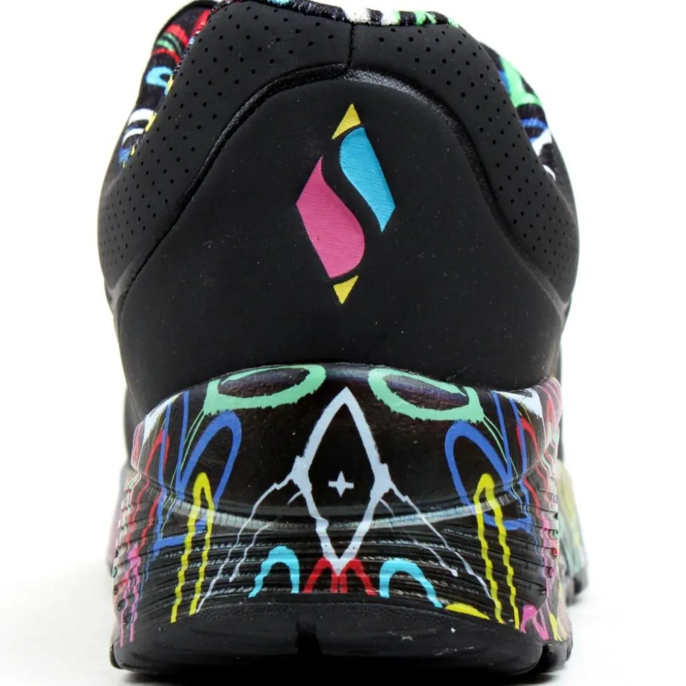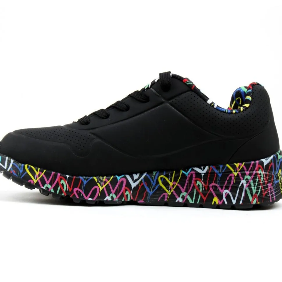 Nike Air Max runners inspired style from Skechers kids runners range. This shoe has a black upper with graffiti effect heart decoration to the sole.This shoe has Skechers Air Cooled memory foam insole enuring all day comfort.