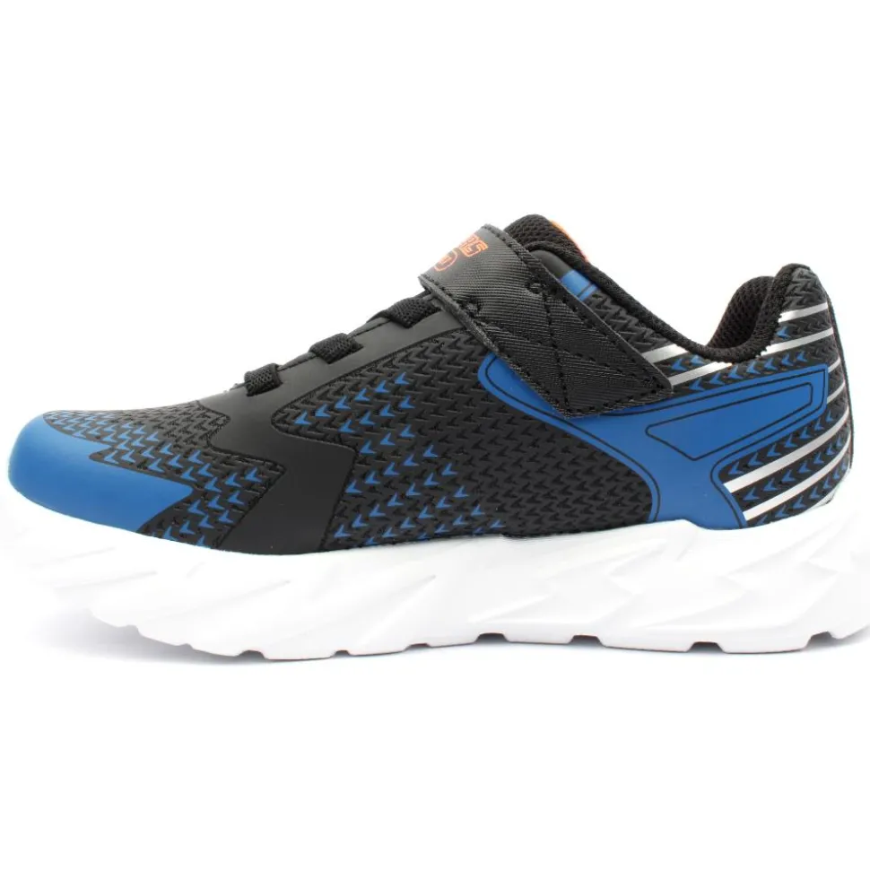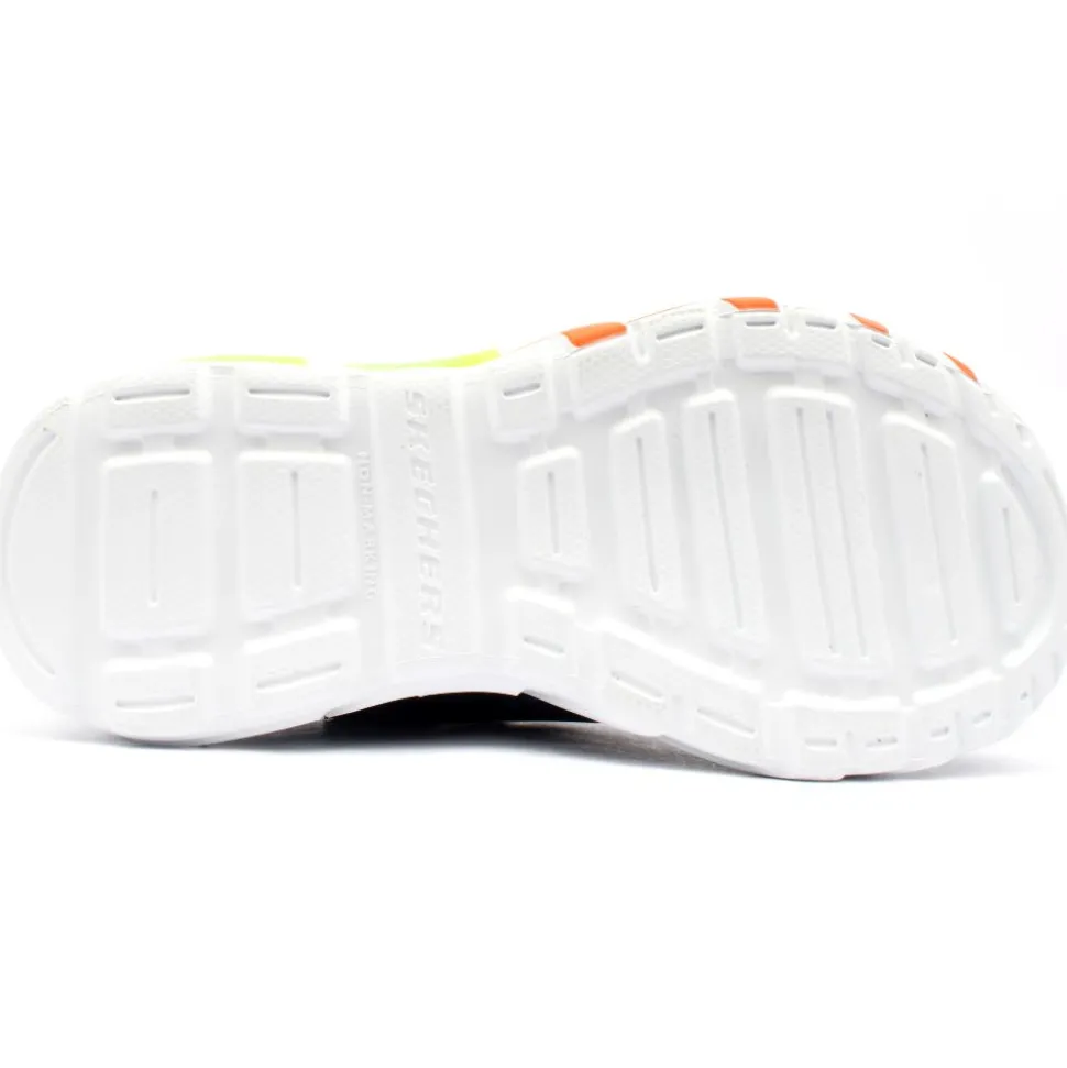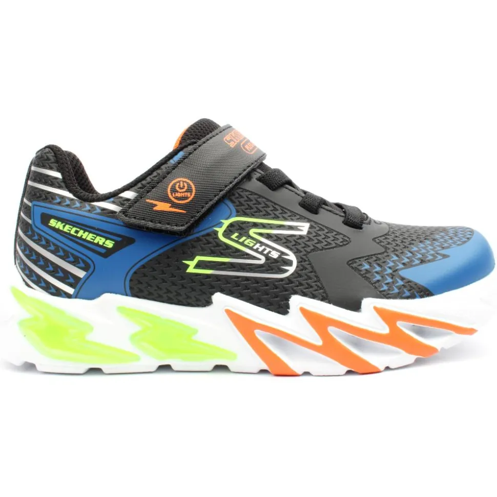 Boys runner from Skechers. Stand out from the crowd with this cool boys runner. This sporty light up runner has an athletic mesh & synthetic upper with a multi colour design. The light up sole can be controlled with on/off button on the velcro strap.