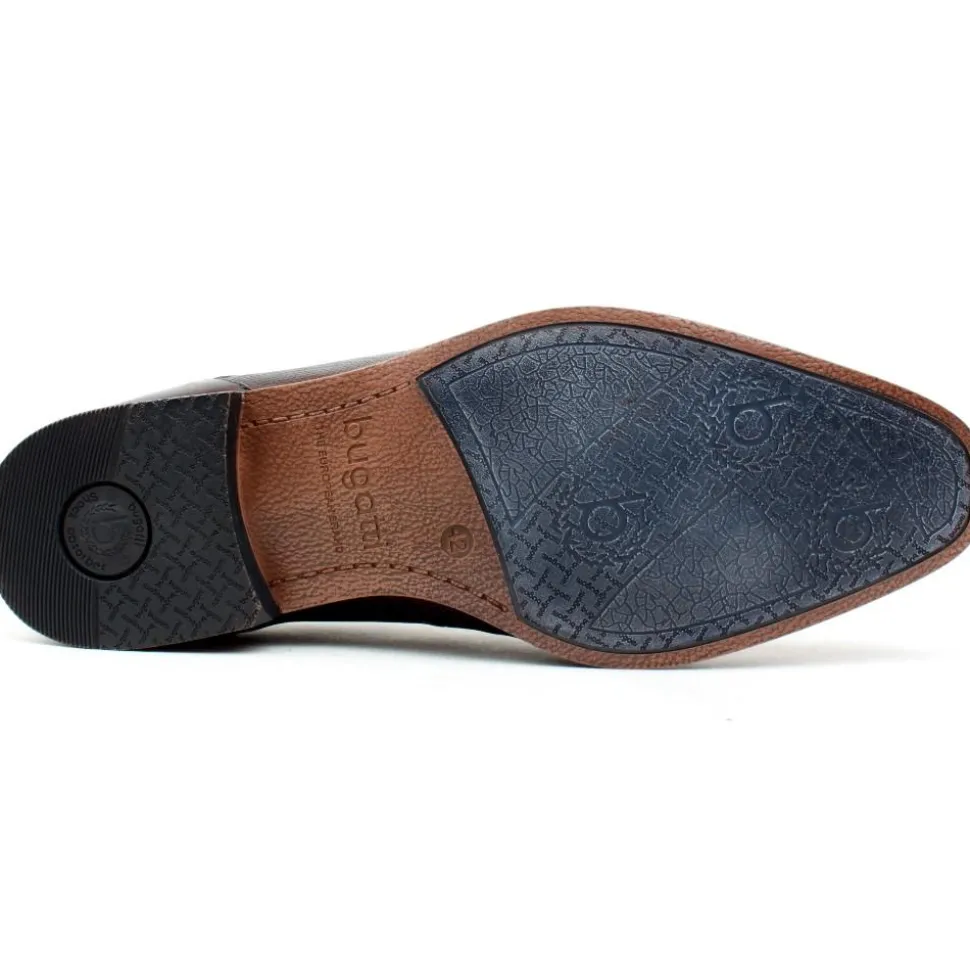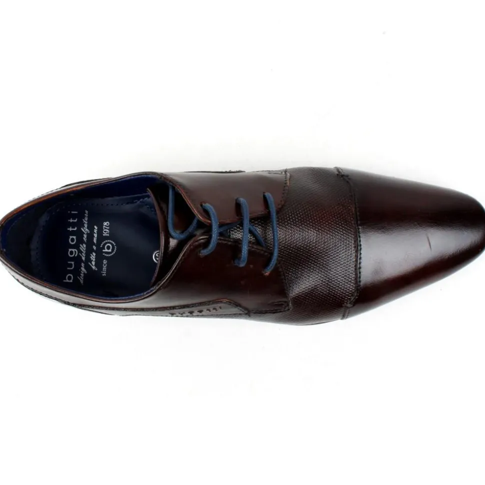 Mens suit shoes from Bugatti Shoes. These formal shoes have a rich dark brown leather upper complimented by navy laces, allowing it to compliment any sharply dressed individual while providing them with comfort and durability. The outsole has a shock absorber in the heel for added comfort.