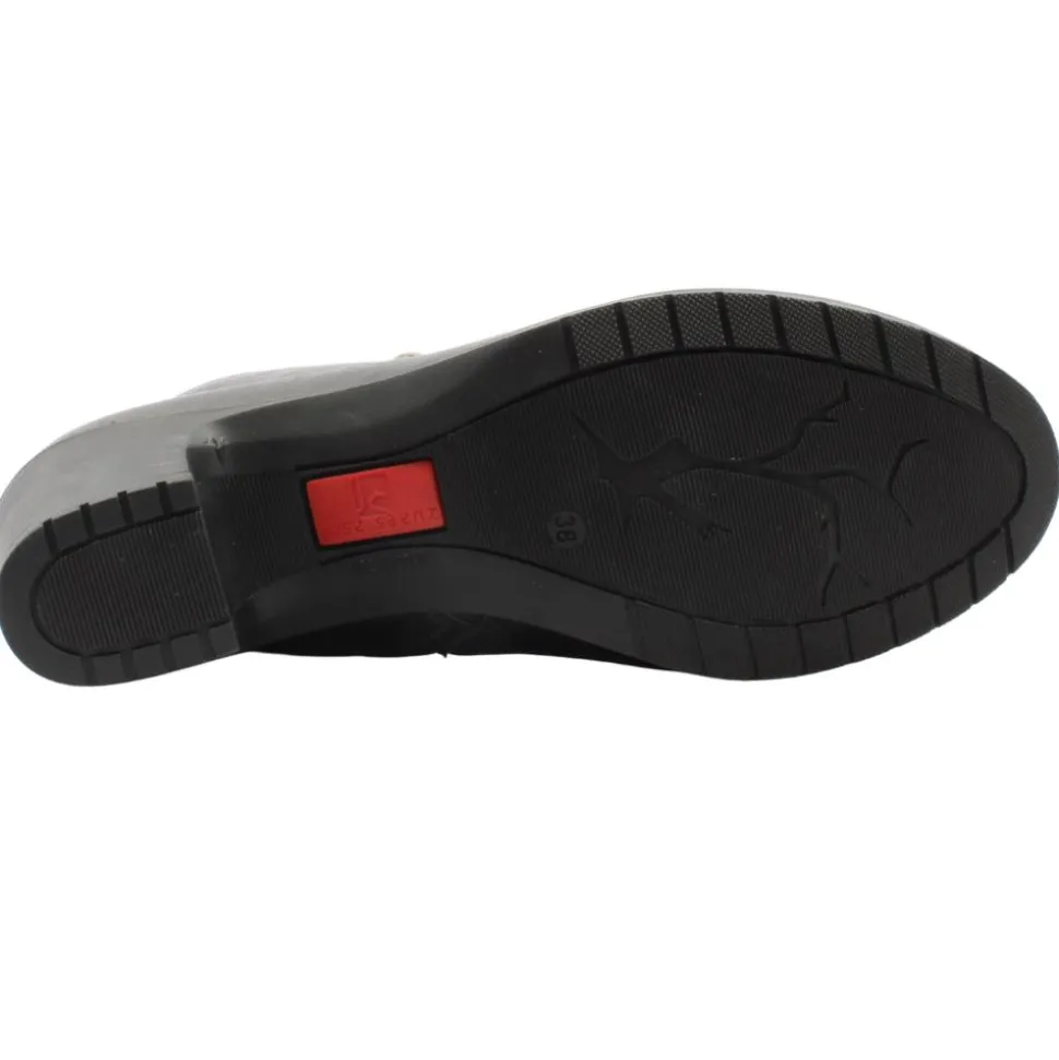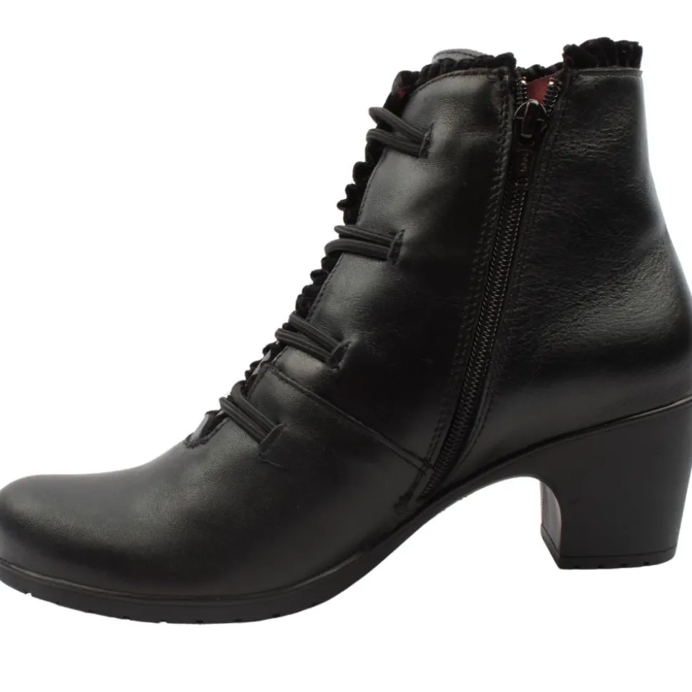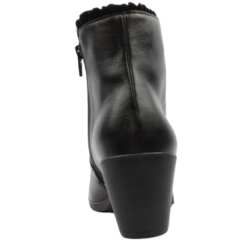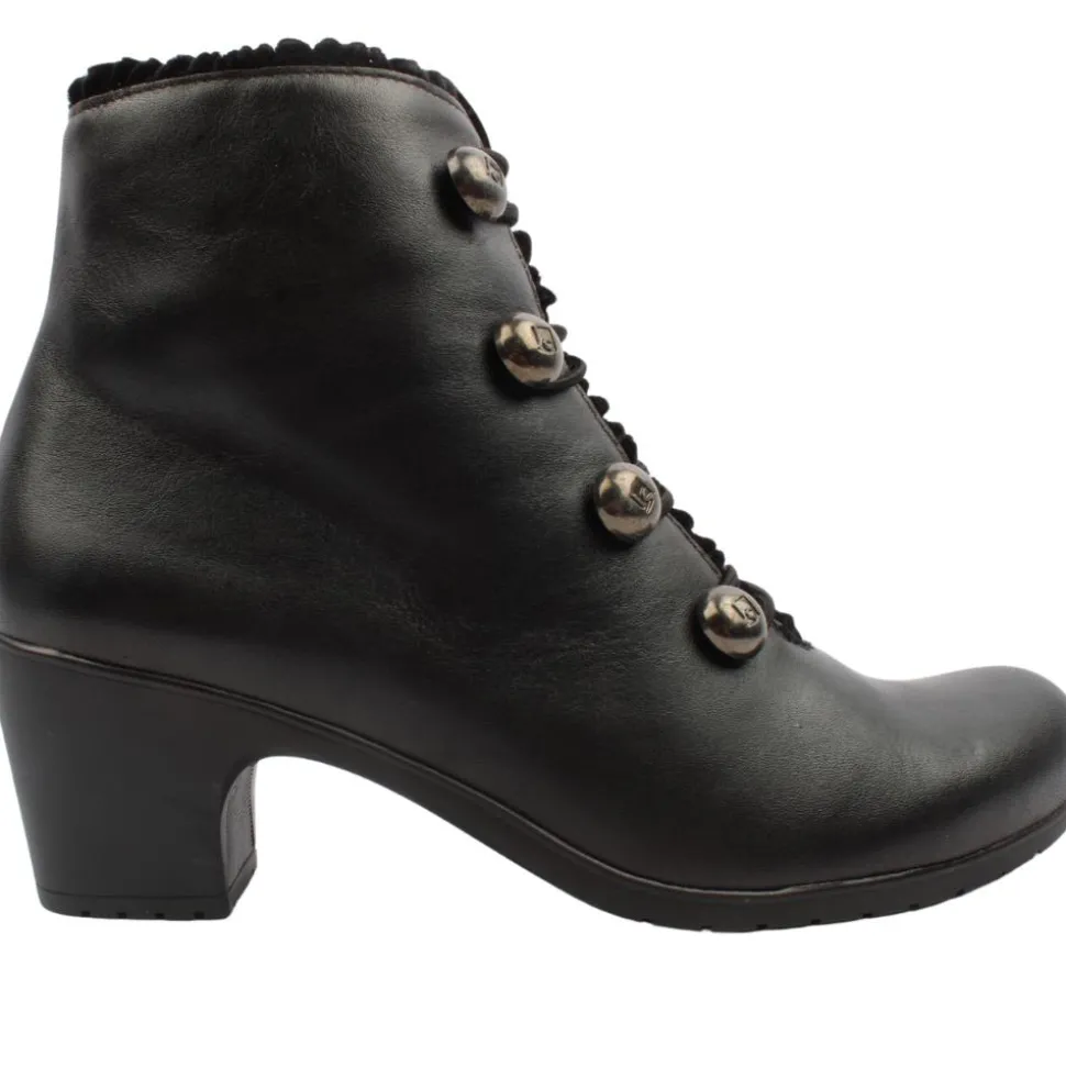 The Military Inspired Ladies Dressy Ankle Boot, model 5176 from Jose Saenz, offers a bold and fashionable statement. Designed using a classic soft black leather upper, The military-style buttons along the sides lend a distinctive, edgy touch, while the convenient side zip allows for easy on and off. The block heel adds height and elegance, complemented by a cushioned, flexible outsole for comfort and stability. The removable insole provides additional customization for a perfect fit, making this boot a stylish and comfortable choice for any occasion.