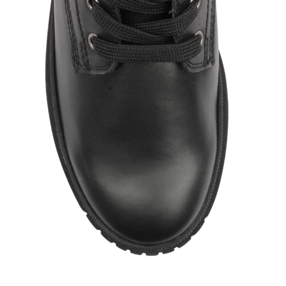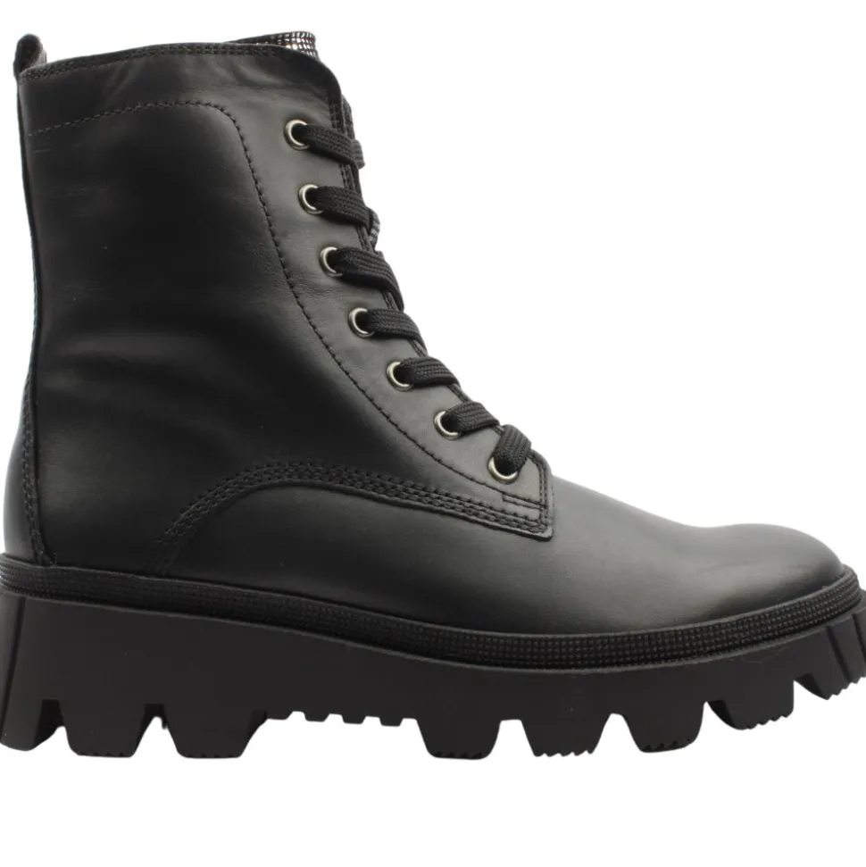 Ladies biker boots from our Gabor boots range designed for the fashion-forward individual who values both style and comfort.The smooth black leather upper is broken up by the silver design on the tongue. The combination of zip and lace closure allow for easy on/off and a custom fit.A Gabor best fitting insole adds to the comfort of this style making them perfect for all-day wear.