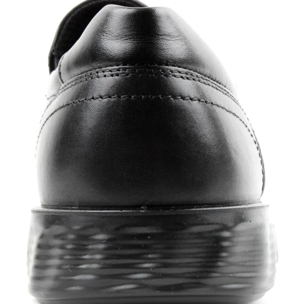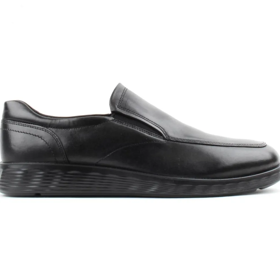 Mens slip on shoes from ECCO shoes.These mens shoes have a soft black leather upper with elasticated gueests to aid easy on/off. The Ecco dual fit leather insole is removable and allows for a wide fit.