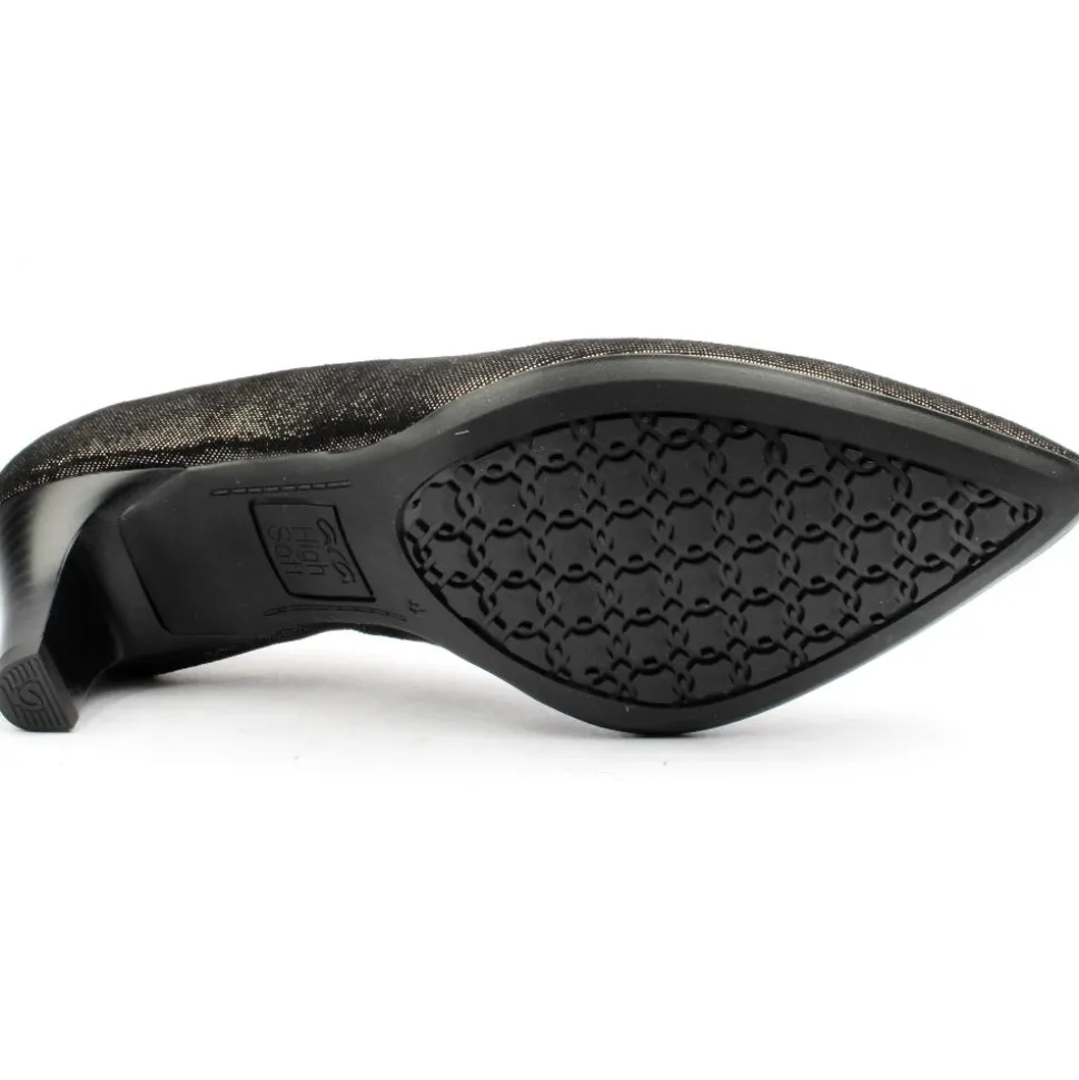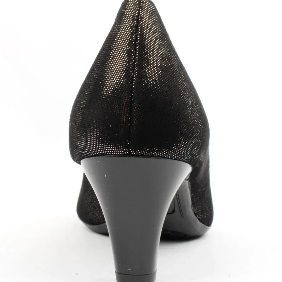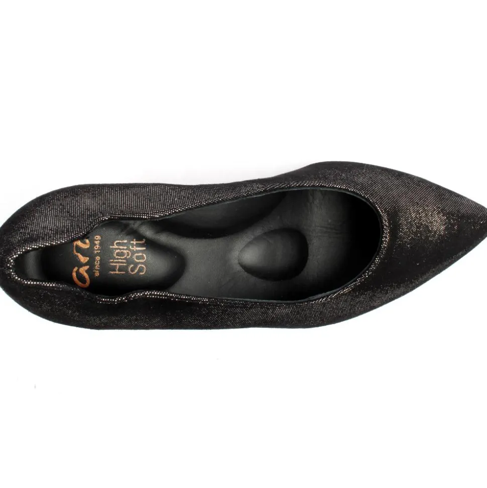 Wide fitting court shoes from Ara Shoes. These dressy heels have a black metallic shimmer upper with a pointy toe and low heel. They have a cushioned Ara High Soft insole for added comfort.