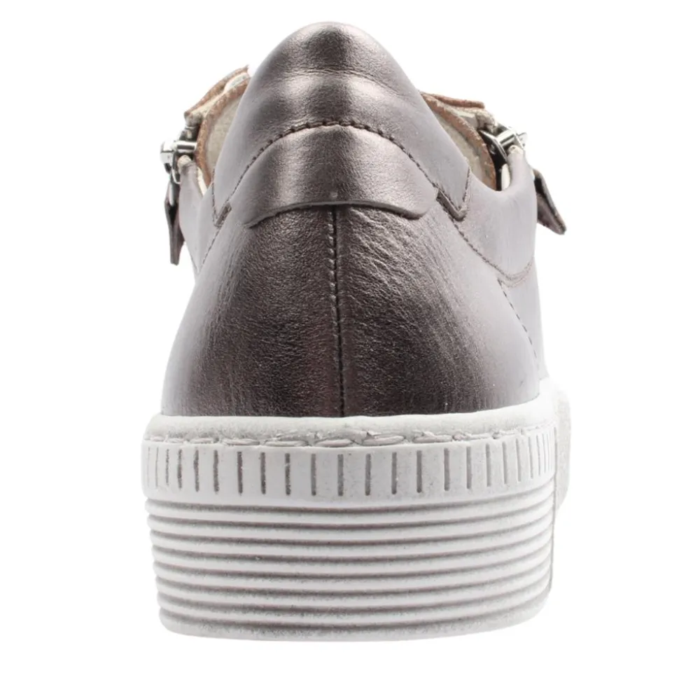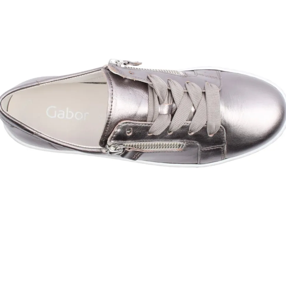 Stylish and comfotable Gabor ladies trainers, sat upon on a platform sole. Featuring a metallic leather upper, this shoe is effortlessly fashionable. The convenience of double side zips and a lace closure ensures easy on/off access. For added comfort, this style comes with a Gabor “Best fitting” removable insole, catering to those in need of orthotics.