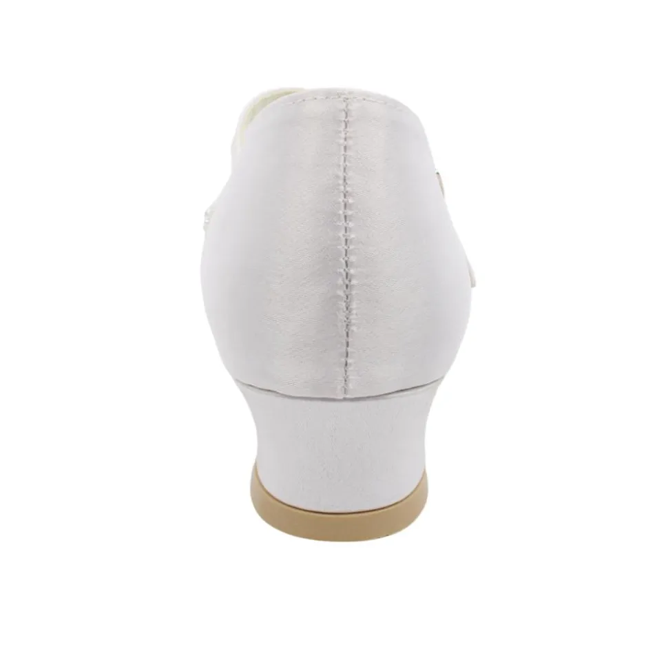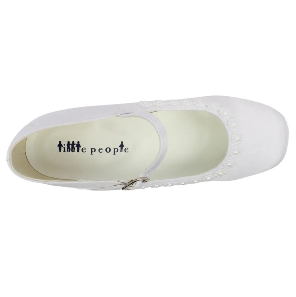 White Satin Communion shoe from the Little People collection. This stunning shoe has a row of pearl decorations around the shoe. A strap & buckle closure ensure the foot is kept secure at all times.