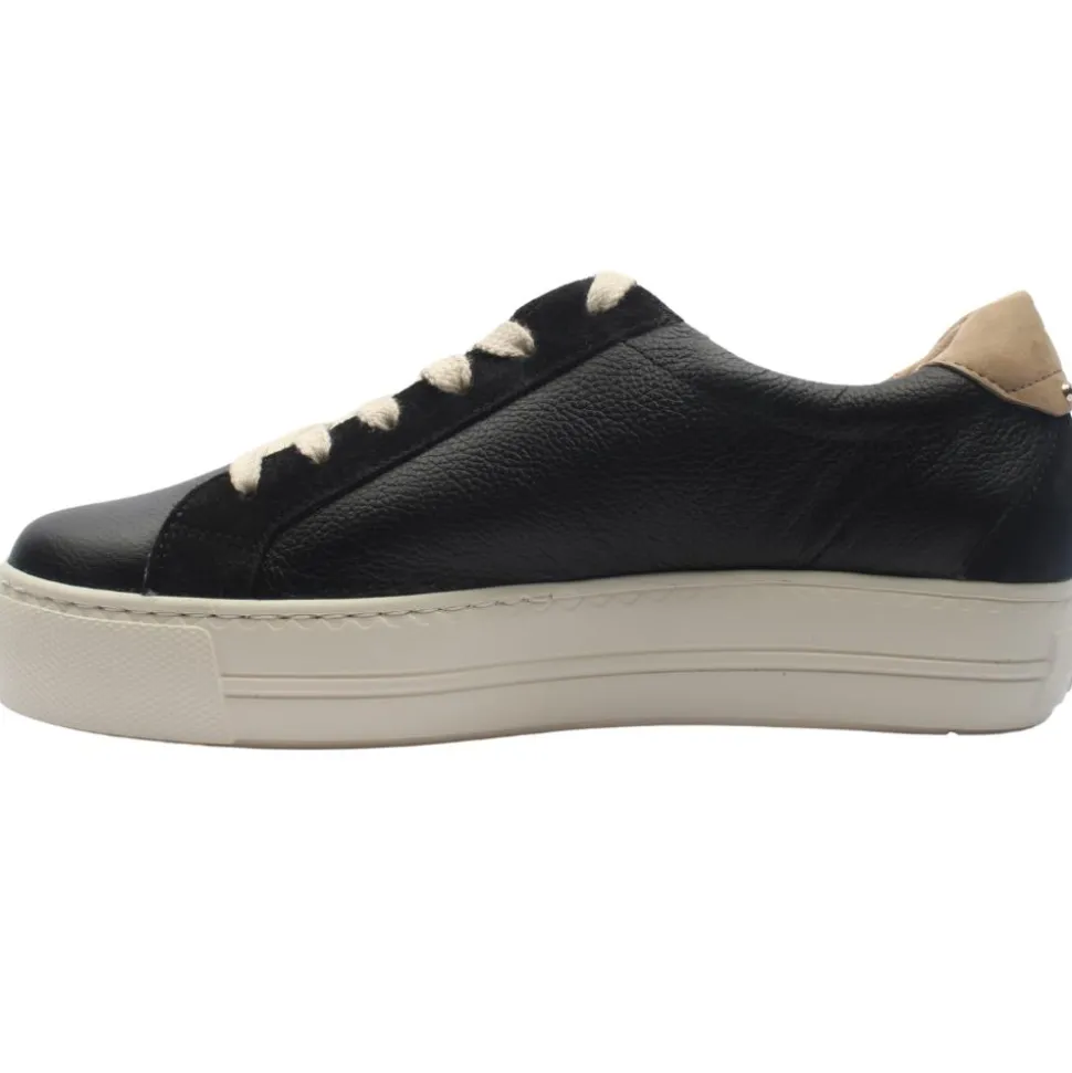 Add a touch of glamour to your everyday style with the Paul Green Shoes-5430 ladies trainers. Crafted from soft black leather with luxurious black nubuck detailing, these shoe exude understated sophistication. A gold glitter accent on the side elevates the design, adding a chic sparkle that dresses up any outfit. The soft leather insole offers supreme comfort, while the low-profile platform outsole ensures modern appeal and effortless wearability. Perfect for casual outings or when you want to add a subtle shine to your ensemble, this runner combines elegance, comfort, and versatility.