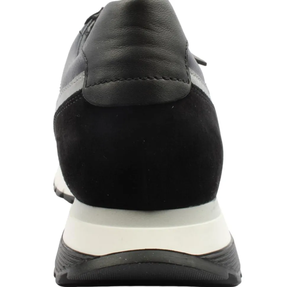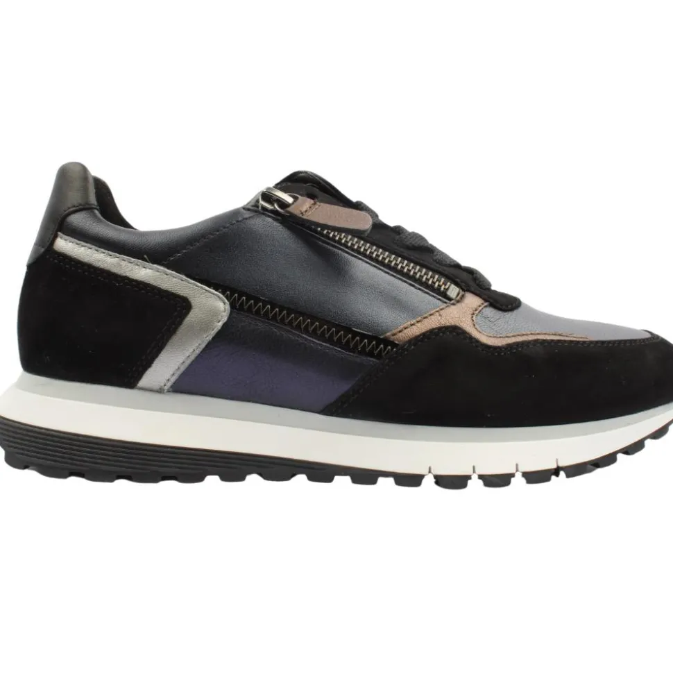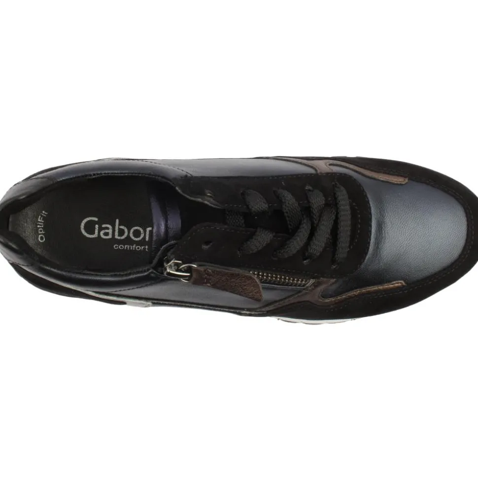 Womens casual shoes from Gabor shoes. Gabor Lightweight Shoe, available in a striking combination of navy, black, silver, and gold. Designed with a flexible sole, this shoe provides excellent support and agility. This shoe is perfect for evryday wear, designed with Gabors own comfort insole. This shoe is great for those looking for some extra width.