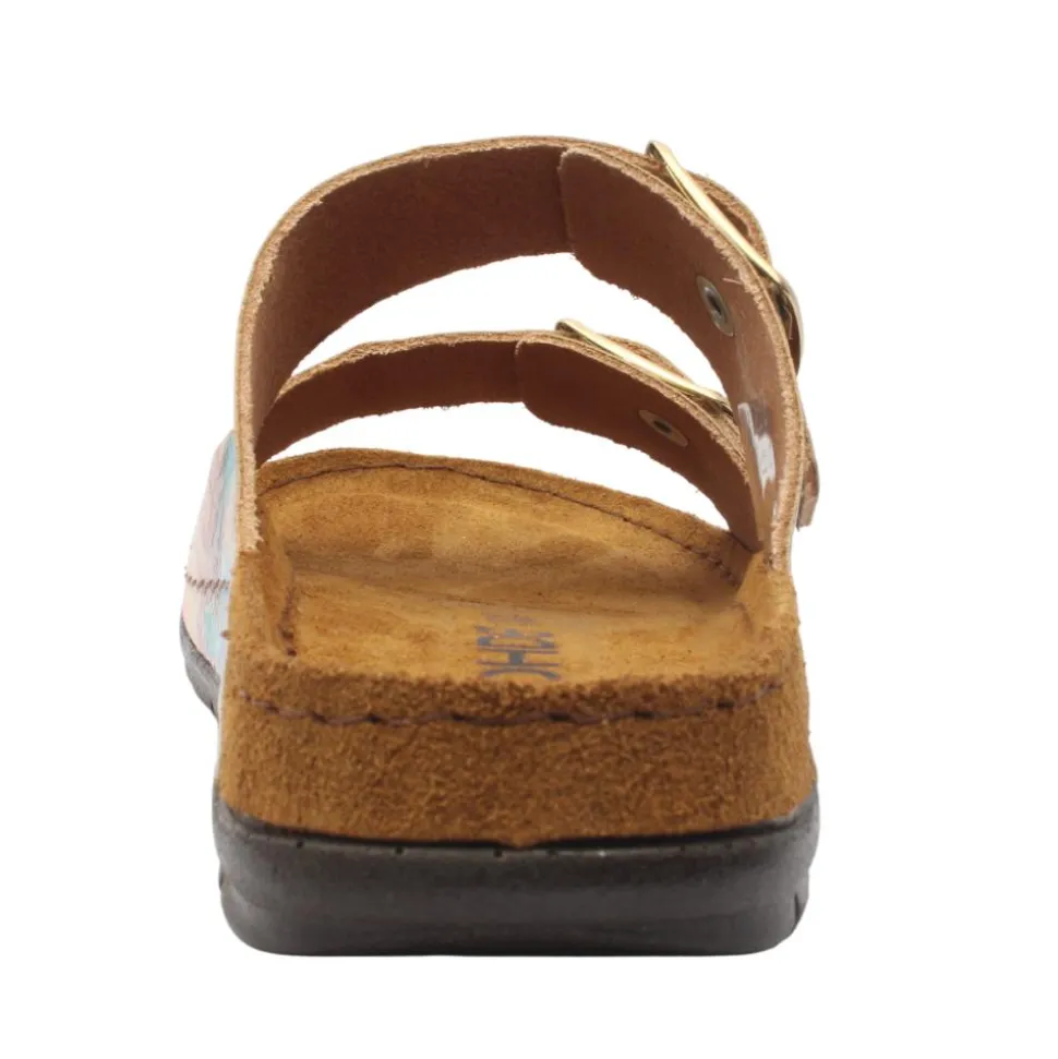 Introducing a casual mule from Rhode. This mule features a golden background with intricate floral detailing. It comes with two adjustable straps for a customised fit. With a cushioned insole and flexible sole, this sandal offers both comfort and versatility.