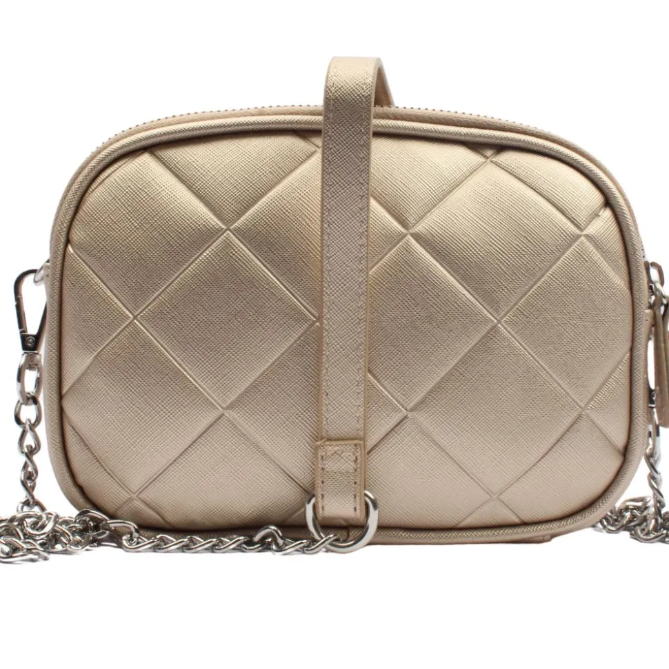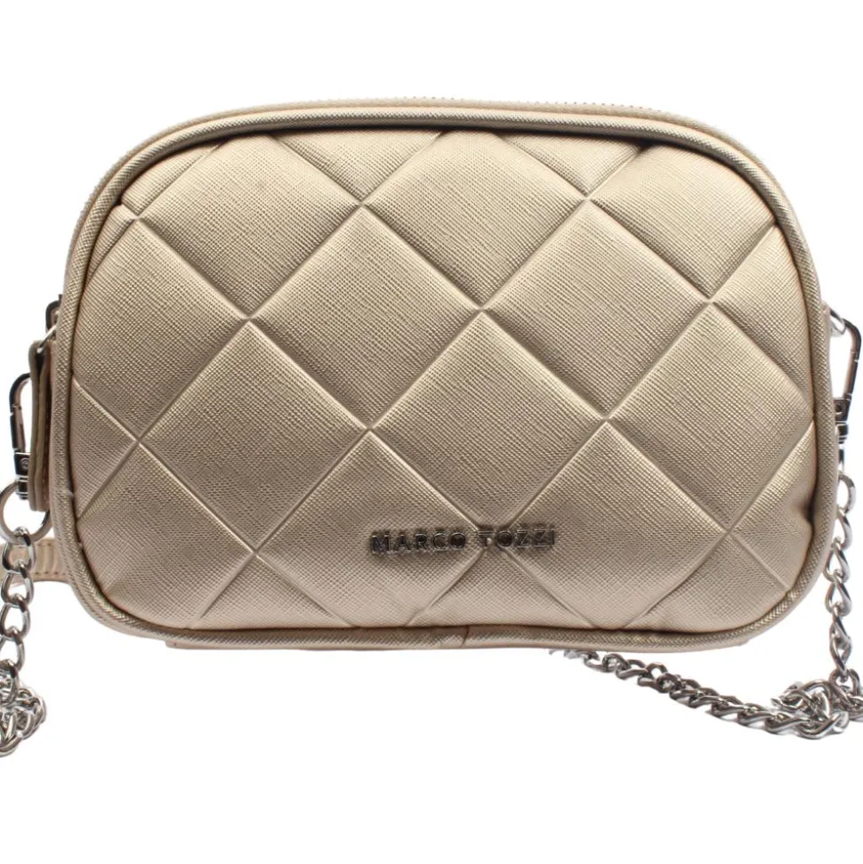 Add a touch of elegance to your look with the Marco Tozzi 261136 Gold Bag. This chic and compact accessory features a sleek gold finish, perfect for both casual and evening wear. Designed for practicality and style, it includes two zip compartments to keep your essentials secure and organized. The silver chain shoulder straps add a modern contrast, giving the bag a sophisticated edge.