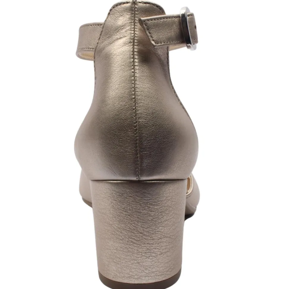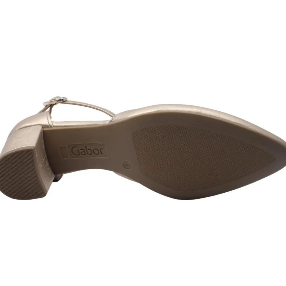 Dressy womens shoes from the Gabor shoes collection. This beautiful shoe is designed with a gold upper. They have a block heel for stability and comfort. Designed with an ankle strap to adjust the width around the ankle.The heel is perfect for any occasion offering optimal comfort.