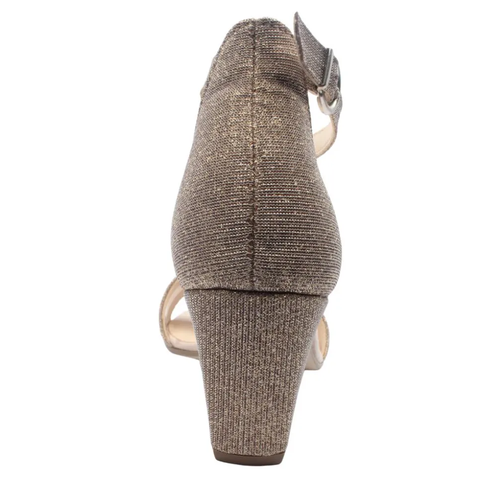 Introducing a strappy barely-there sandal from the Gabor shoes collection. This sandal features a delightful rose gold glitter upper, complete with an ankle strap closure. The inclusion of a sturdy heel and leather insole contributes to the overall comfort of the sandal, making it an excellent choice for any elegant occasion.