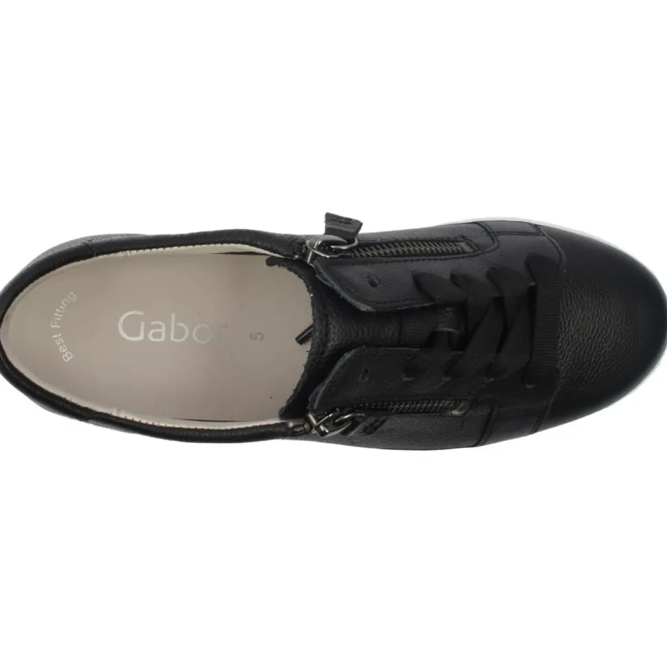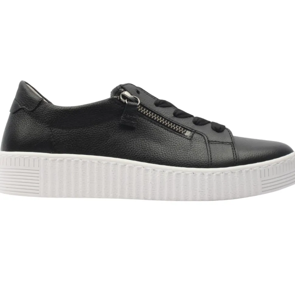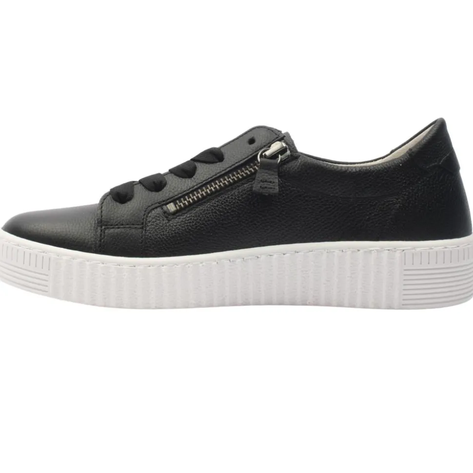 Experience the perfect blend of elegance and practicality with the Gabor Ladies Runners, 63334 in Black Smooth Leather. .The contrasting white outsole adds a modern touch, making these runners a chic statement piece. The lace and double zip closures ensure quick and effortless on-and-off wear. The Removable Cushioned Leather Insole enhances comfort with a soft, supportive feel while allowing for orthotic customization if needed.