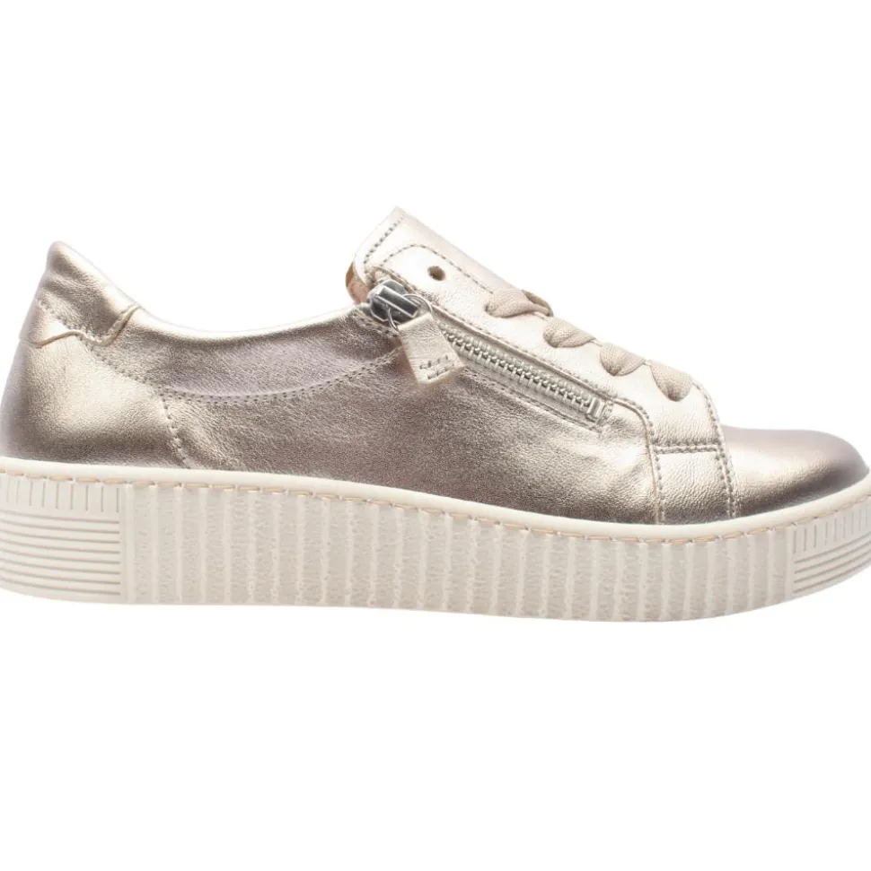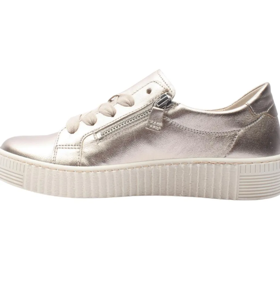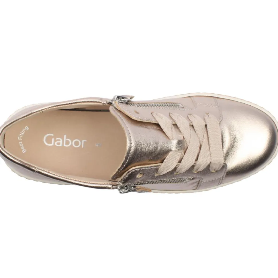 Experience the perfect blend of style and comfort with these Gabor shoes, 63334 in a metallic gold leather upper. The lace and double zip closures ensure quick and effortless on-and-off wear. The removable Gabor best fitting insole enhances comfort with a soft, supportive feel.This insole is removable allowing for orthotic customisation if needed.
