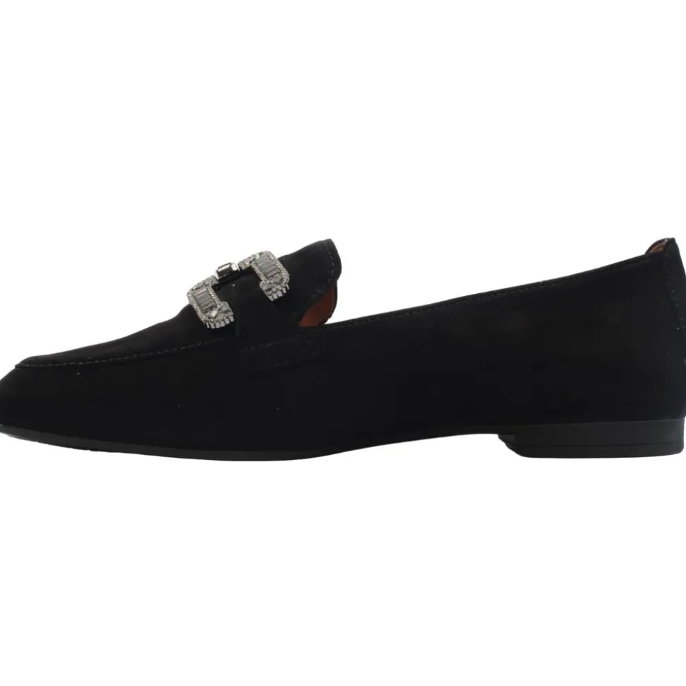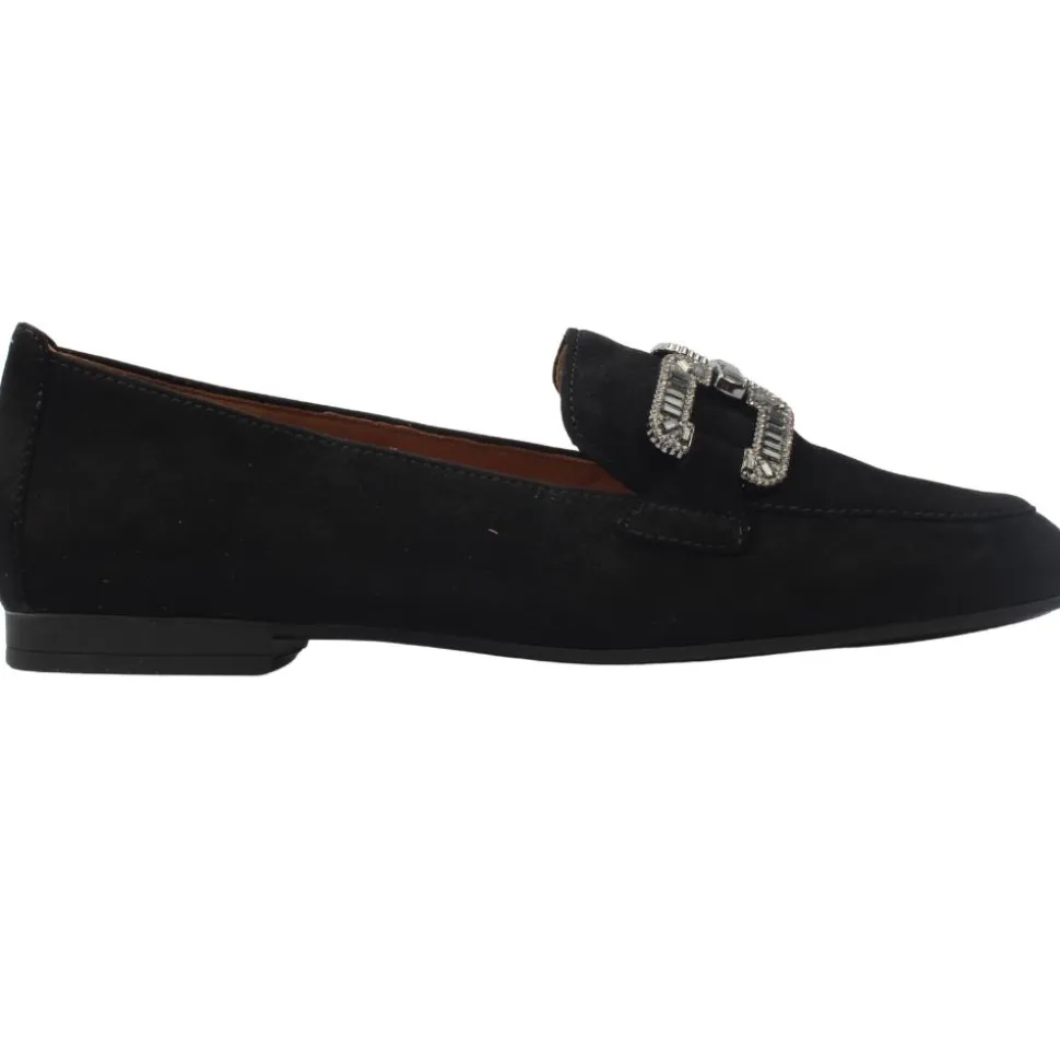 Add a touch of sophistication to your wardrobe with the Gabor Elegant Dressy Loafer 65210 in Black Suede. Perfect for special occasions or refined everyday wear, these loafers offer unmatched comfort and timeless elegance. Adorned with an elegant brooch detailing on the upper, adding a touch of glamour to the classic loafer silhouette. Super soft construction for an indulgent feel with every step. Flexible design ensures ease of movement and long-lasting comfort