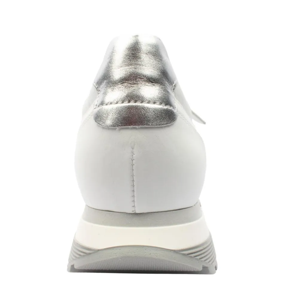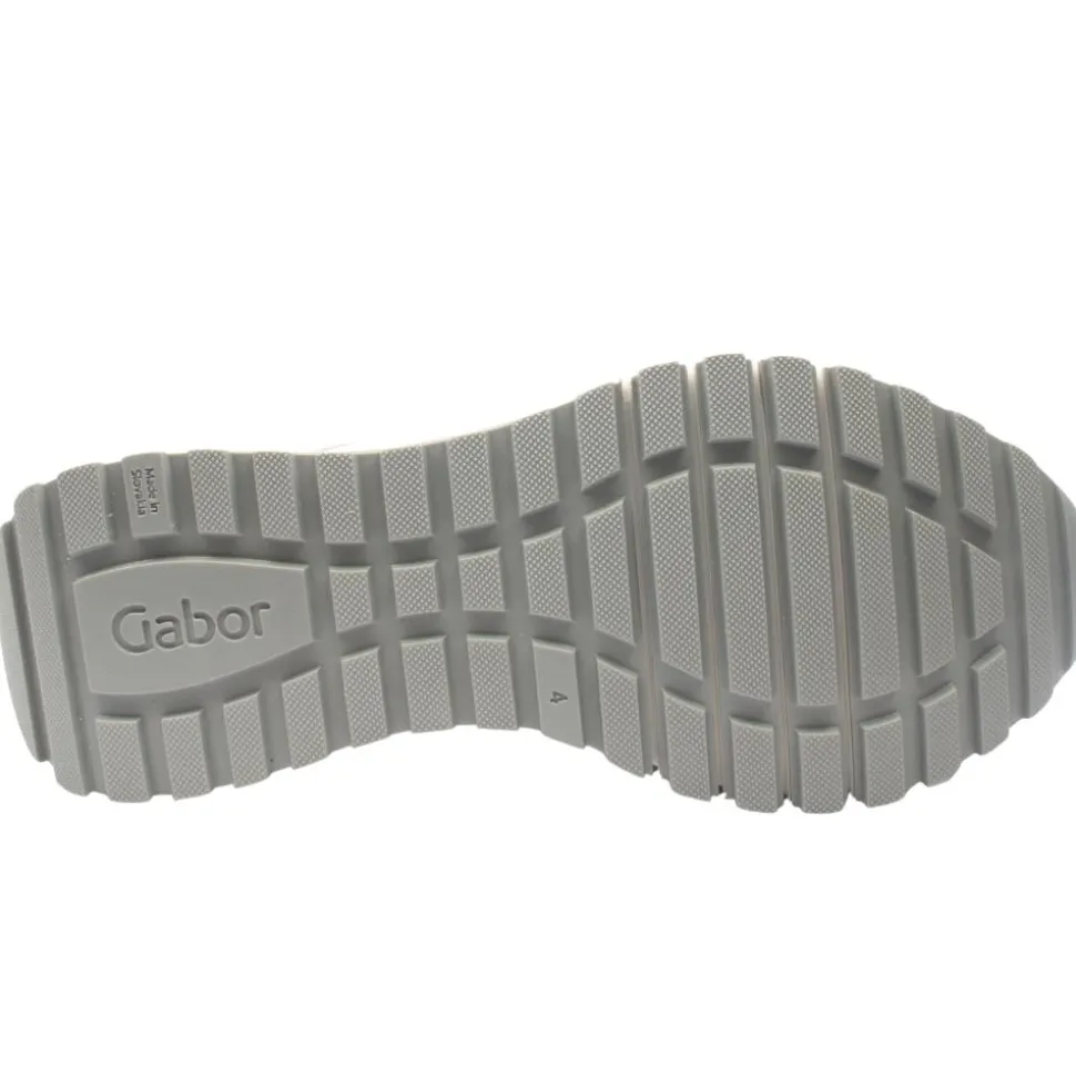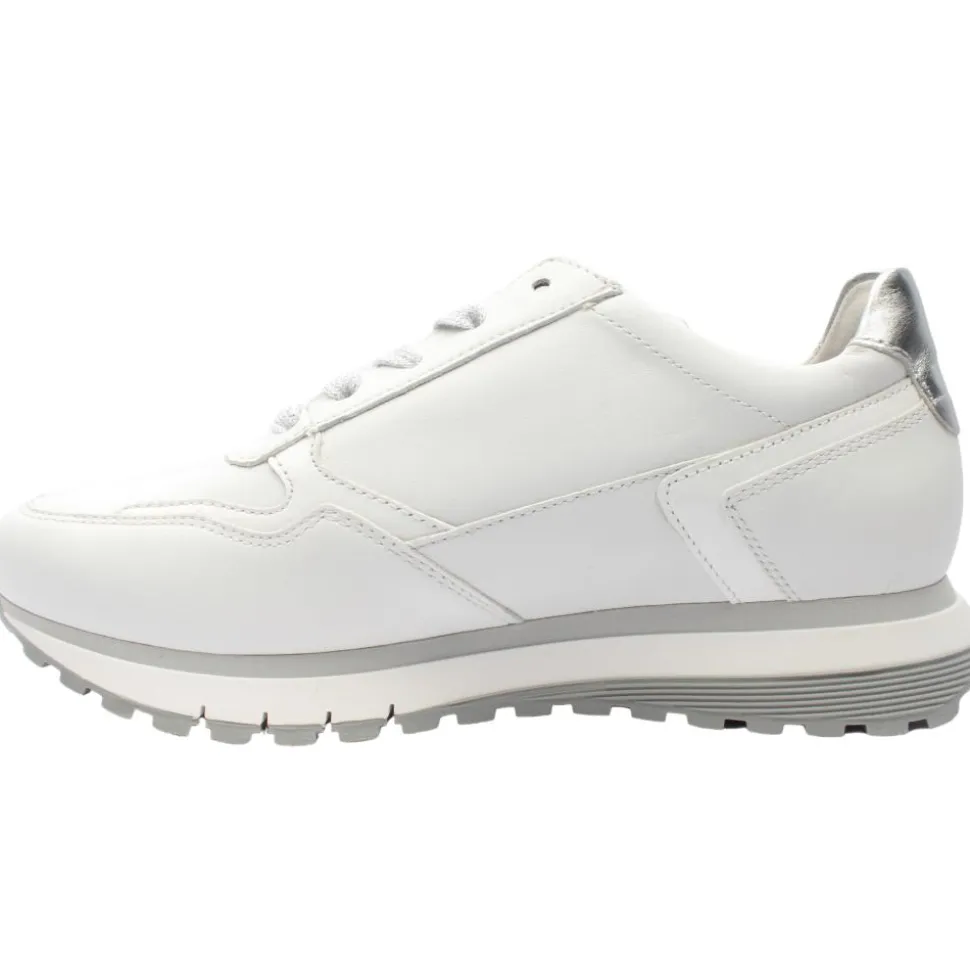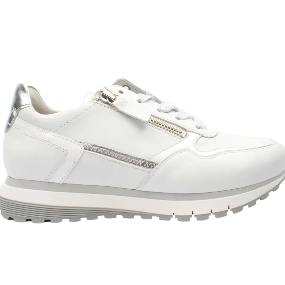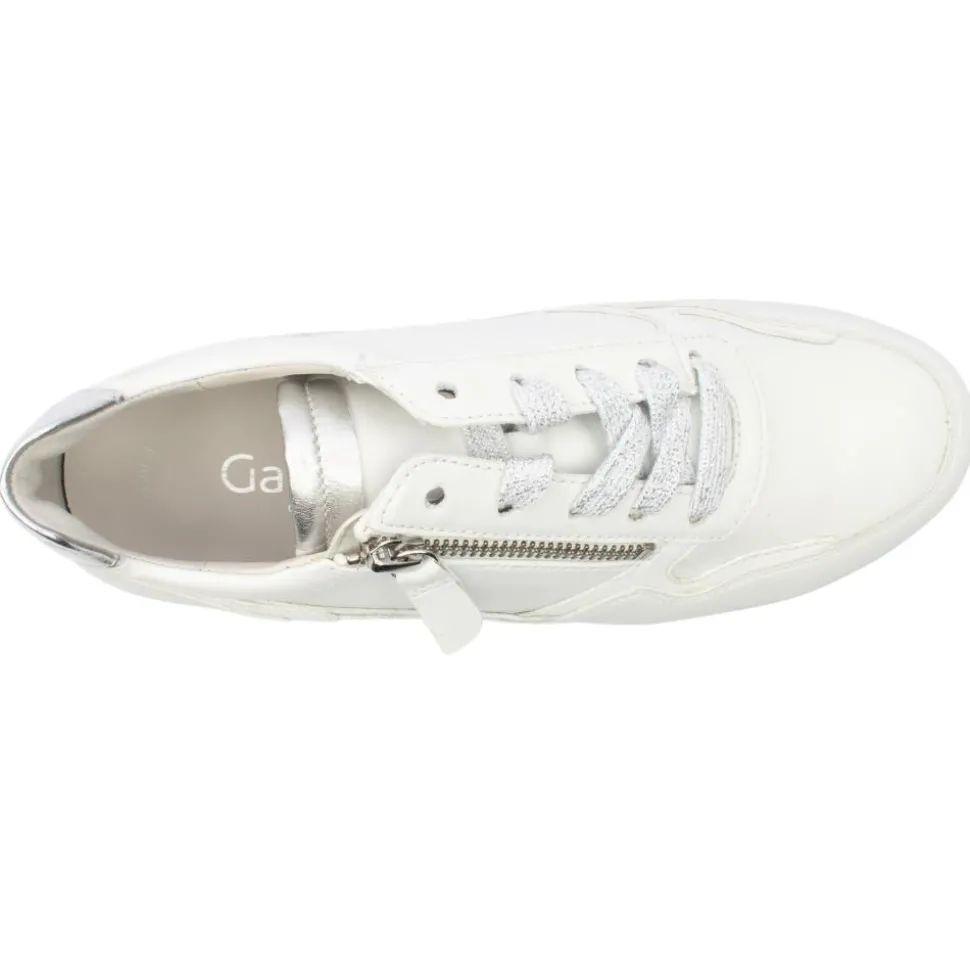 Casual everyday ladies shoes from Gabor Shoes in a crisp white upper with subtle silver detials. The shoe has both a lace & zip closure which allows for easy on/off and a customised fit.A removable Gabor Shoes Opti Fit leather insole allows for a custom orthotic if needed.
