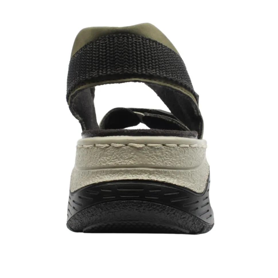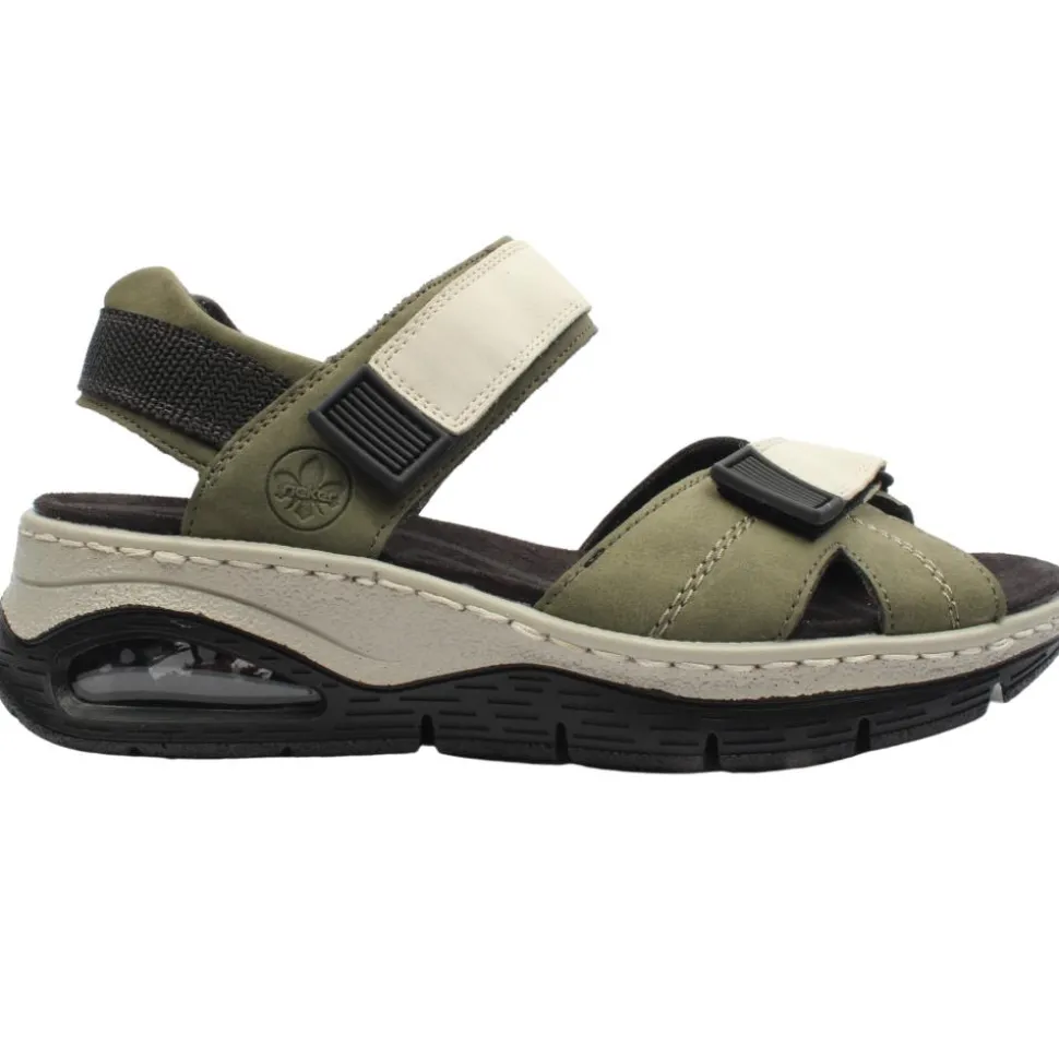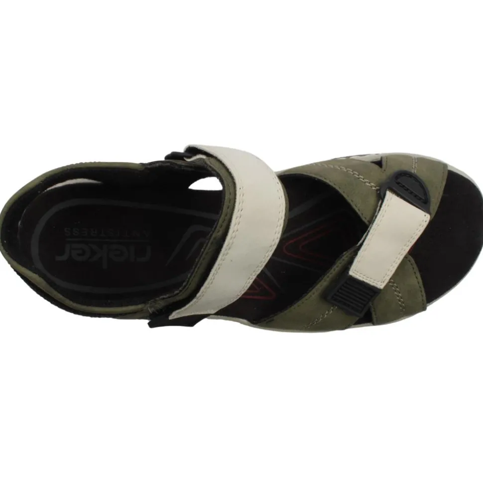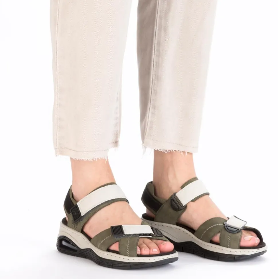 Women’s sandals from Rieker shoes. These sandals are designed with the Riekers Antistress insole, they provide optimal comfort for all day wear. The bubble in the sole provides shock absorption to reduce impact on your feet. With two Velcro straps these sandals allow an adjustable fit for anyone.