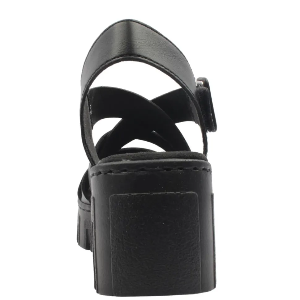Ladies Rieker sandals in an all black finish. The wedge platform sole adds a subtle lift, providing both height and stability for all day comfort. Designed with a Velcro strap, these stylish sandals can be adjusted to allow the perfect fit. The signature Rieker Antistress insole provides superior cushioning and support for all-day wear.