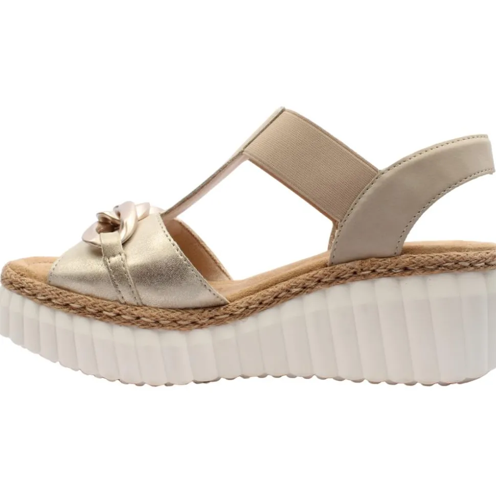 Add a touch of elegance to your summer wardrobe with the Rieker 69158 wedge sandal. Featuring a shimmering champagne upper with gold detailing, this stylish sandal offers both sophistication and comfort. The elastic straps provide a secure fit and effortless slip-on convenience, while Rieker’s Antistress cushioned insole ensures all-day comfort. Finished with an off-white platform outsole for a modern touch, this versatile sandal is perfect for both casual and dressy occasions.