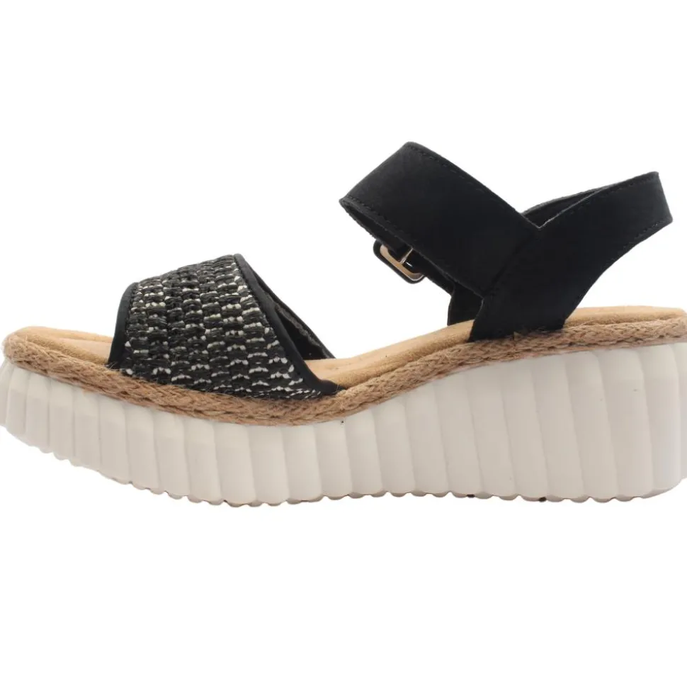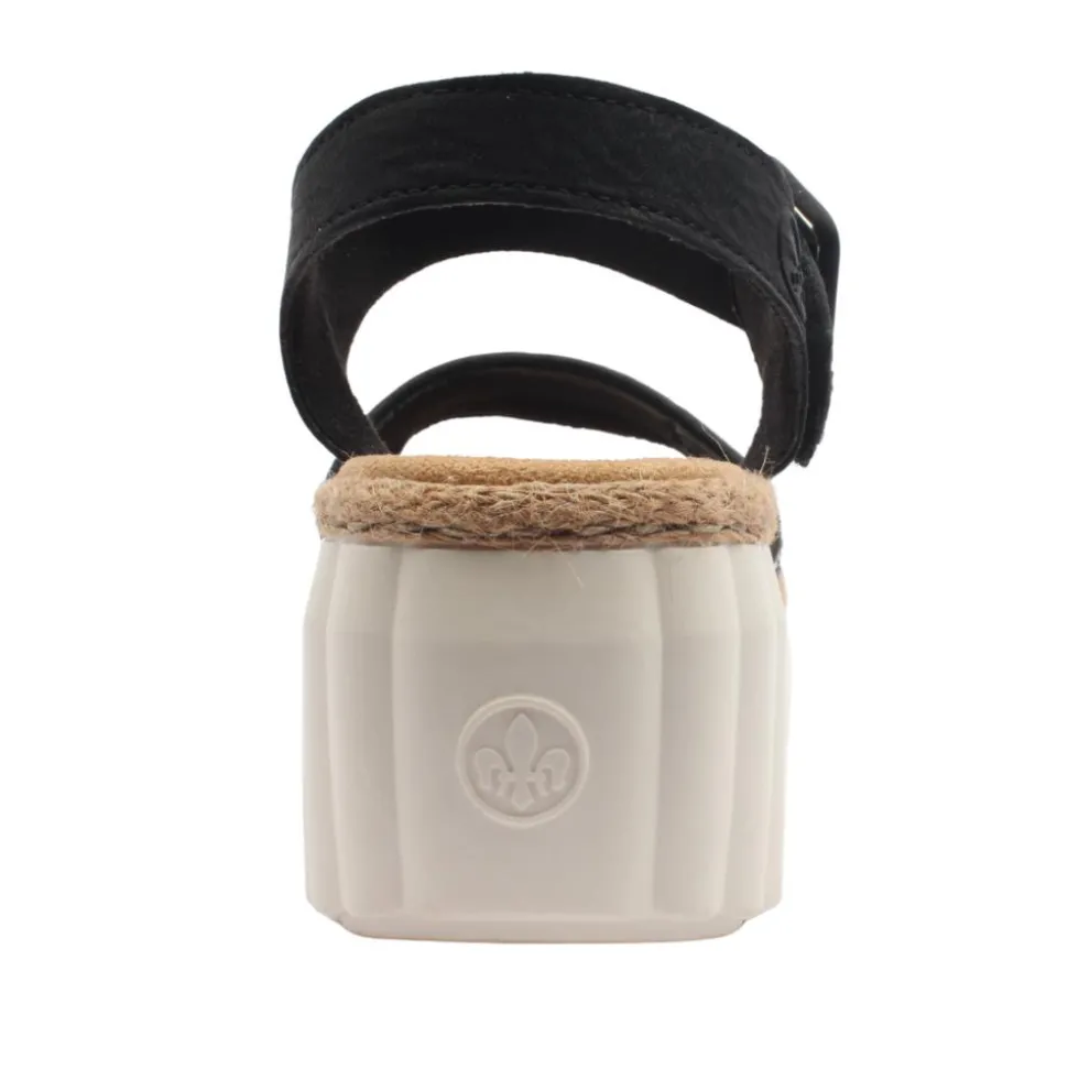 Step into style with these ladies Rieker sandals, designed for all-day comfort. Featuring a black multi upper, these sandals offer a versatile and eye-catching look that pairs perfectly with any outfit. The wedge platform sole adds a subtle lift, providing both height and stability for all day comfort. Designed with a velcro strap clsoure for easy on/off. Rieker’s signature Antistress padded insole ensures superior cushioning and shock absorption, reducing foot fatigue and enhancing comfort with every step.