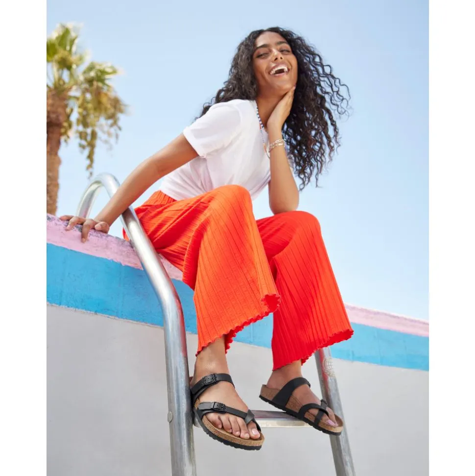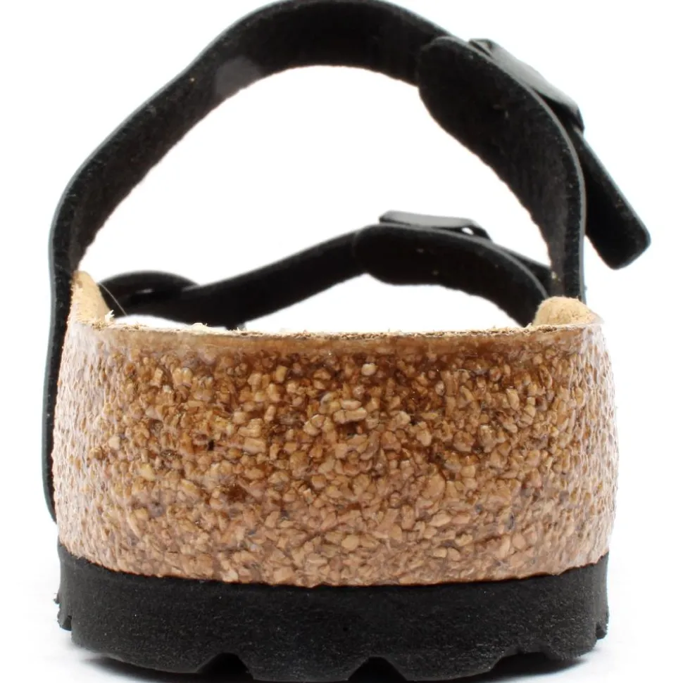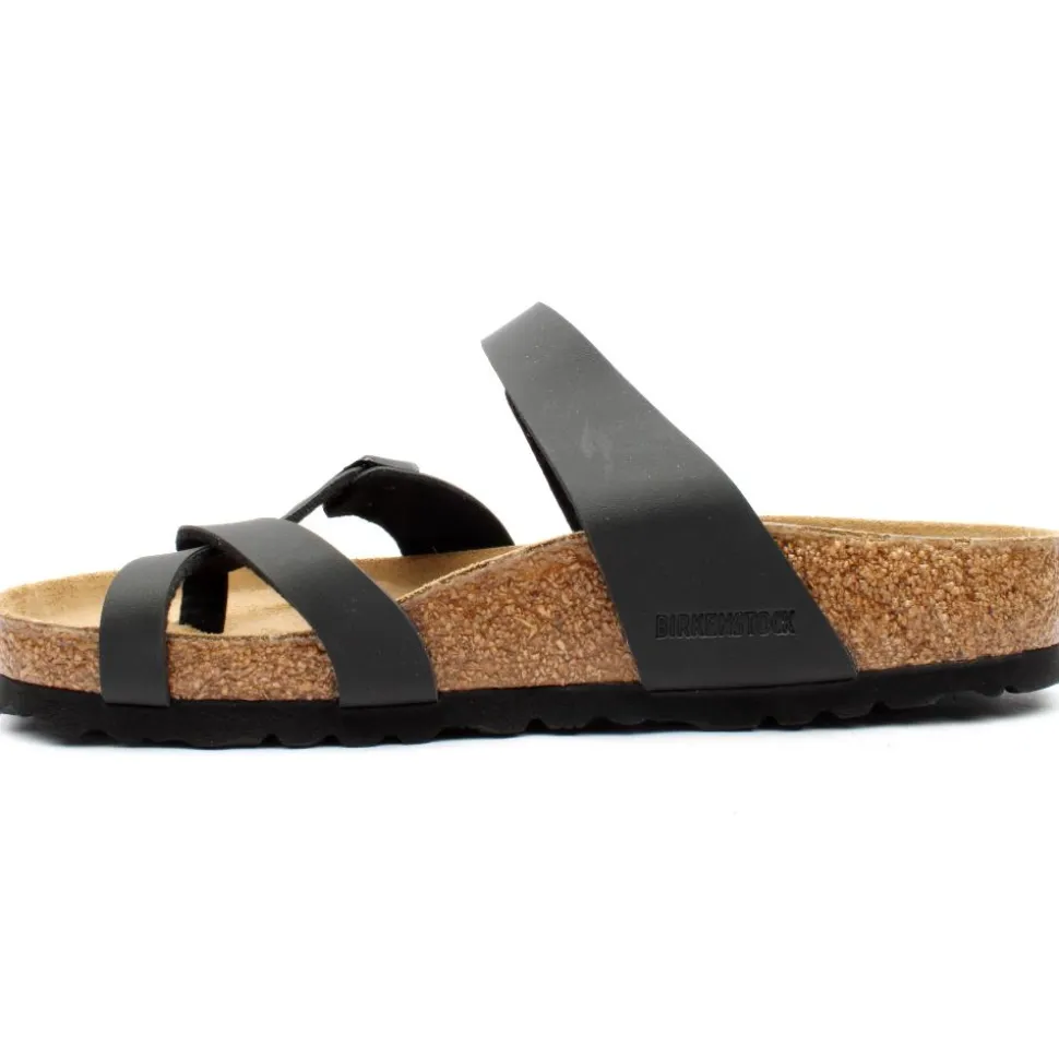 This Birkenstock Mayari is a classic from the collection with a toe loop. These Birkenstock sandals have a black upper, the straps can be adjusted to suit most foot shapes. It has a magicial cork footbed the conforms to the shape of your foot. This is a ‘regular width’ mule.