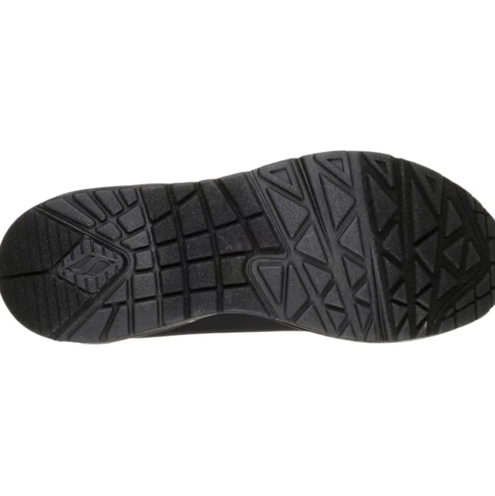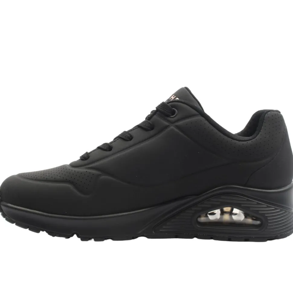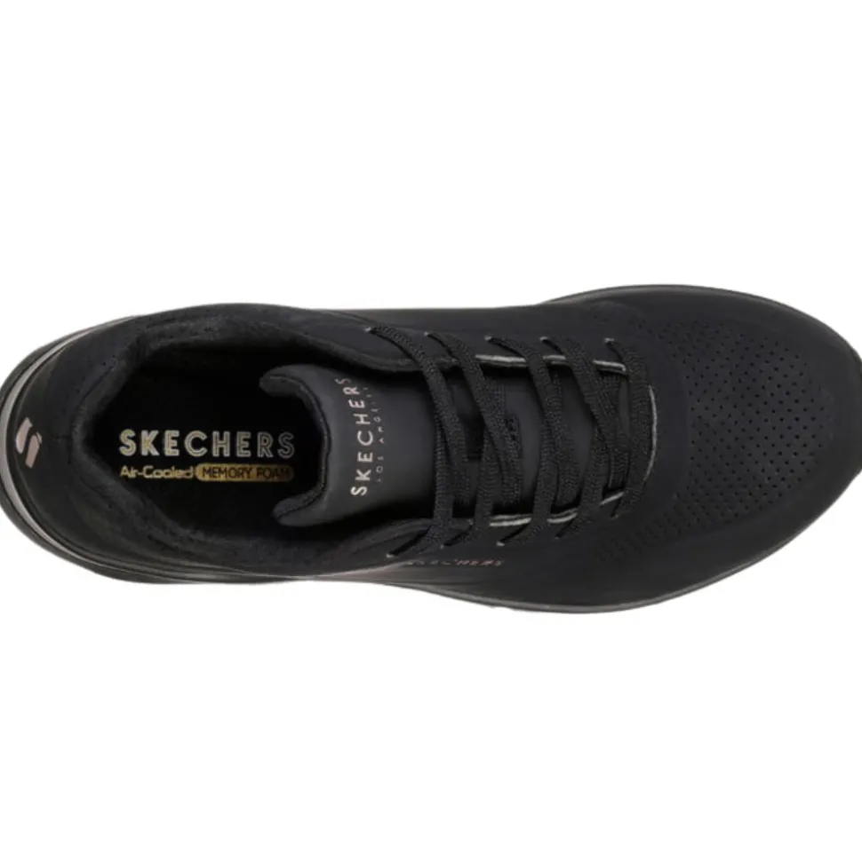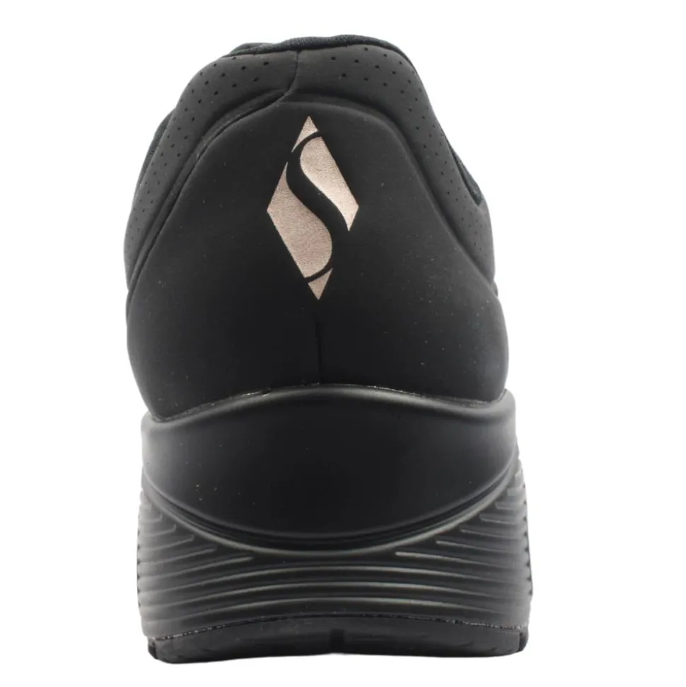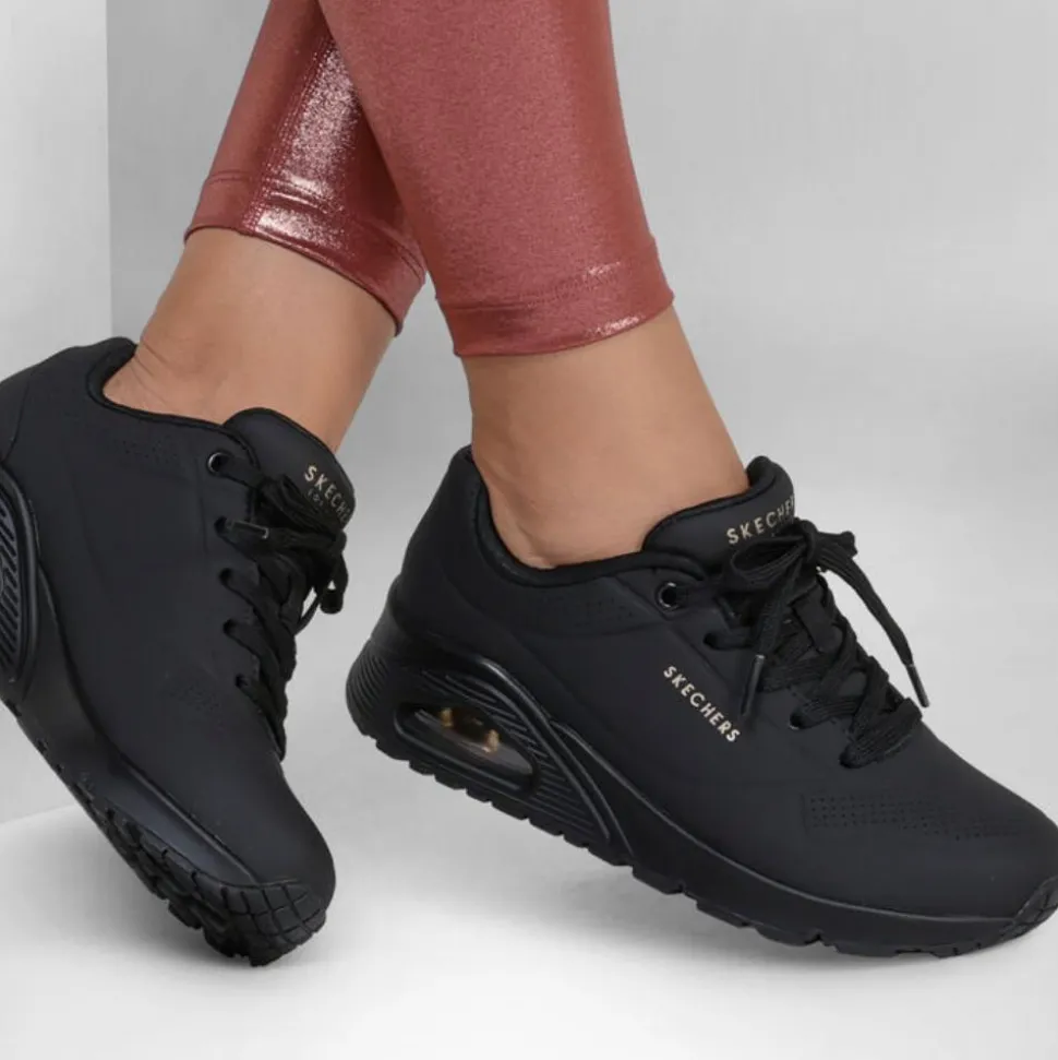 The Skechers UNO are one of the best selling ladies trainers from the Skechers shoes range. These trainers have an all black upper so are perfect for casual or workwear. This runner was designed using a Skechers ‘Air-Cooled Memory Foam’ insole & has a padded collar & tongue which adds to the comfort of the runner.