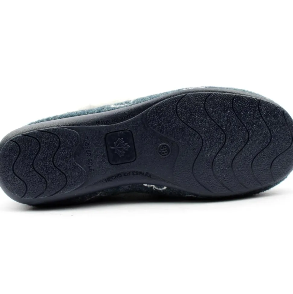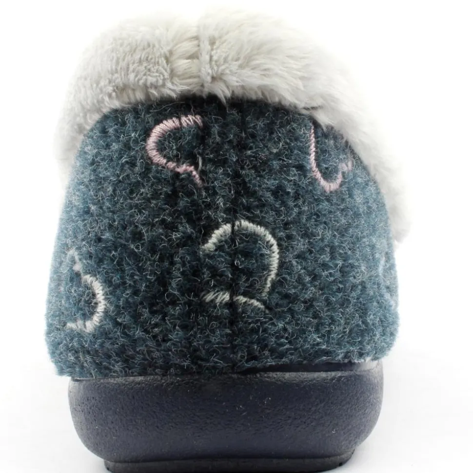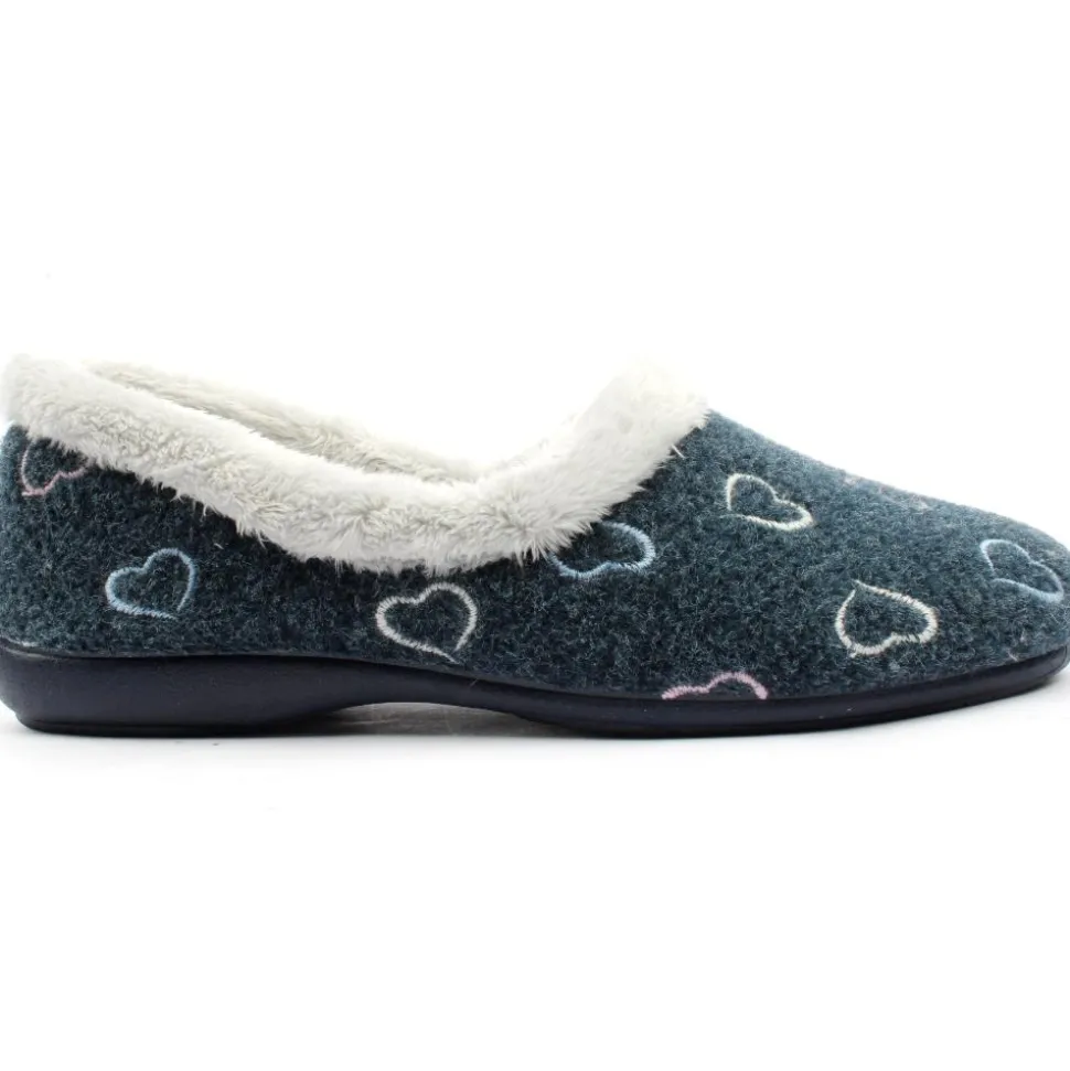 Ladies slippers from Kylebay. The slipper has a navy upper with heart designs. They have a cosy collar and lining.