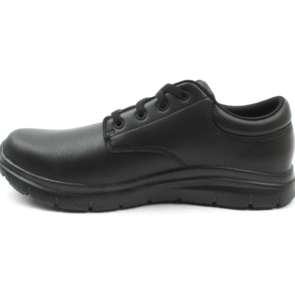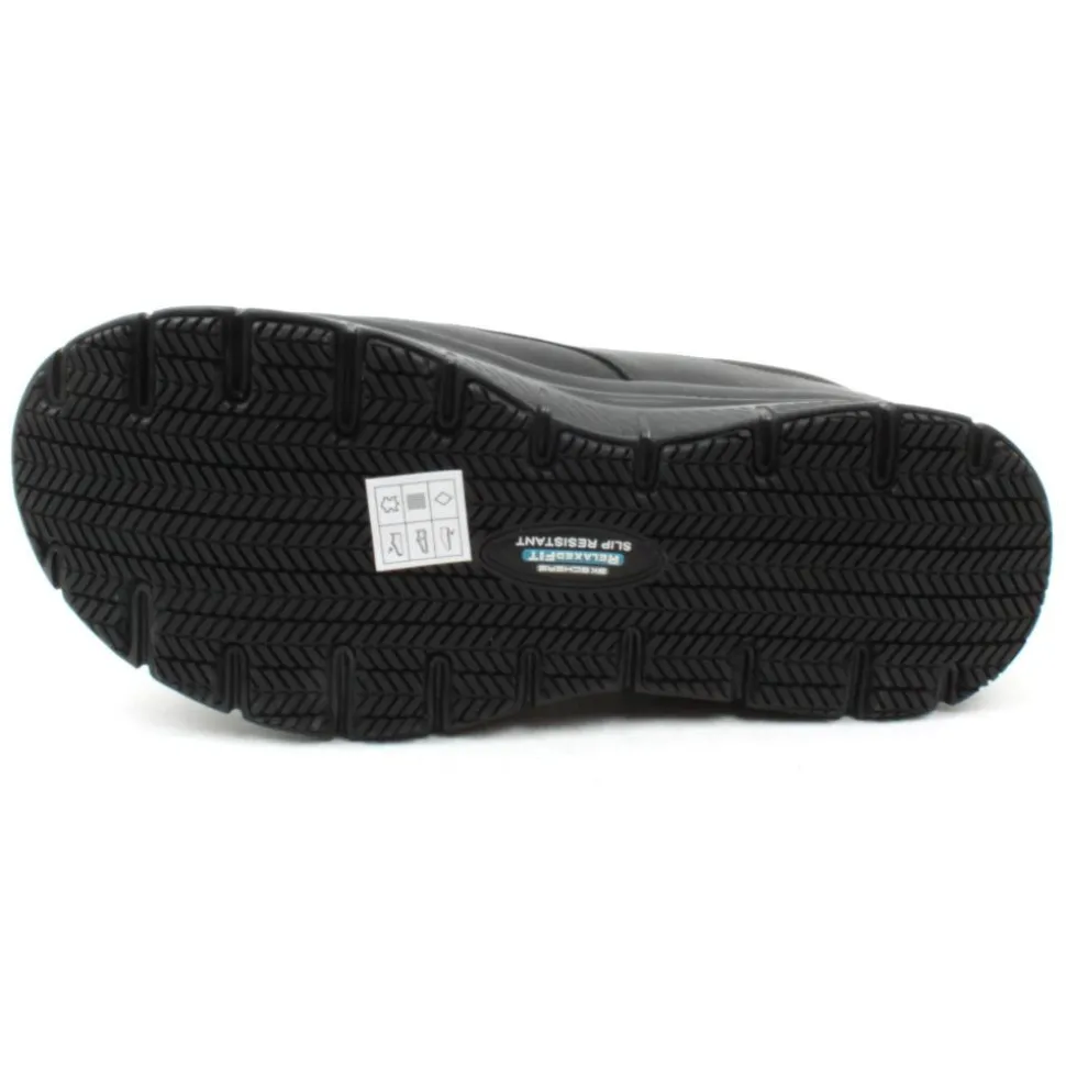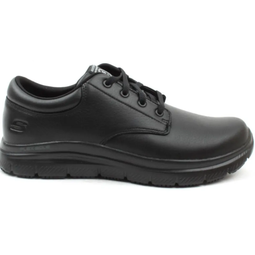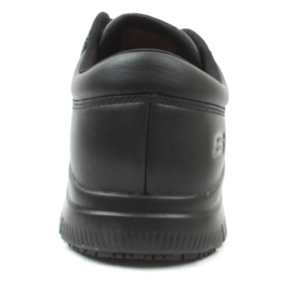 Lightweight casual shoe from the Skechers collection. The shoe has a black leather upper with a lace closure which allows for easy on/off. The shoe has a memory foam insole which adds to the comfort of the shoe. The shoe has a slip resistant sole which gives the wearer piece of mind in work.