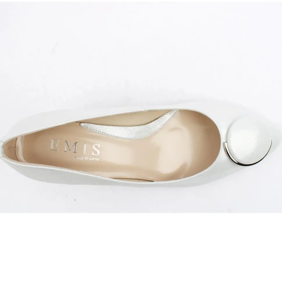Classy court shoe with block heel from Emis Shoes. This dressy shoe has a soft light silver shimmer upper with a circular brooch detail which gives the shoe a high end feel. Great shoe for a special occasion. Cushioned leather insole provides extra comfort.