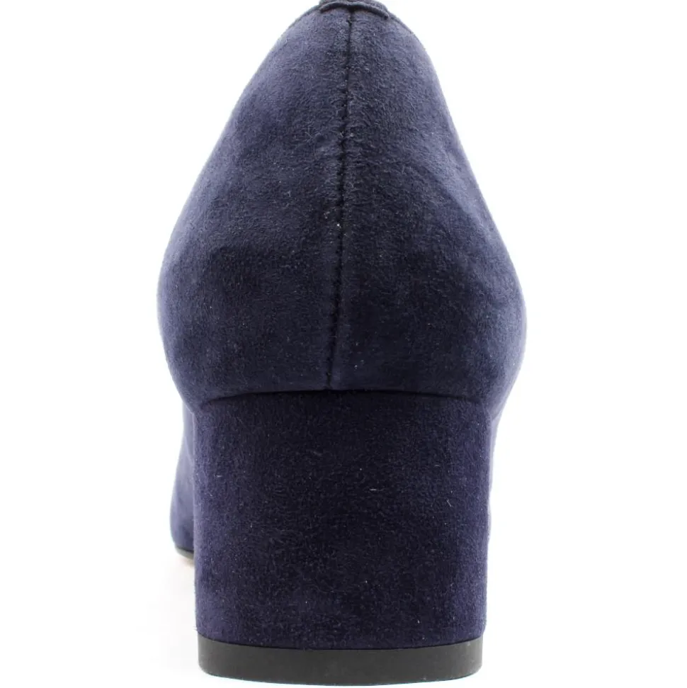 Classy court shoe with block heel from Eims Shoes. This dressy shoe has a navy suede upper with a smooth leather toe cap with a circular brooch detail which sits on top of a bow. It has a U shape at front and a very slightly pointed look to the toe. Cushioned leather insole provides extra comfort. Suitable as a mother of the bride shoe.