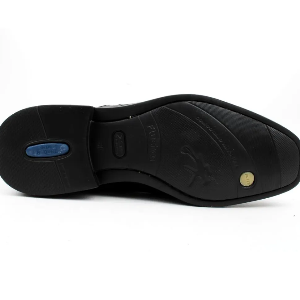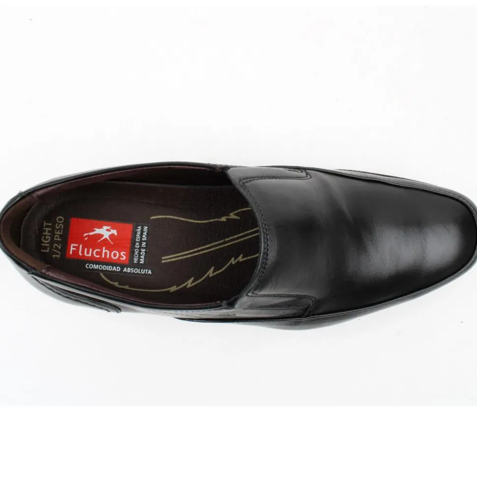 Extra Lightweight Fluchos mens shoe in a black leather upper. These Mens shoes have a removable 100% breathable insole. It absorbs perspiration to leave the foot dry at all times. It also absorbs impact and is extremly flexible. The sole unit is extralight for increased comfort and is made from non-toxic eco-friendly material.