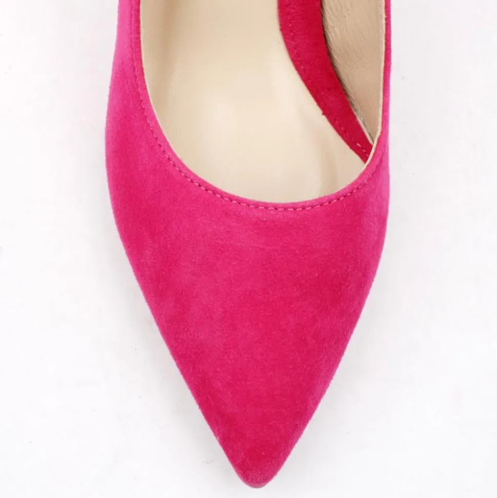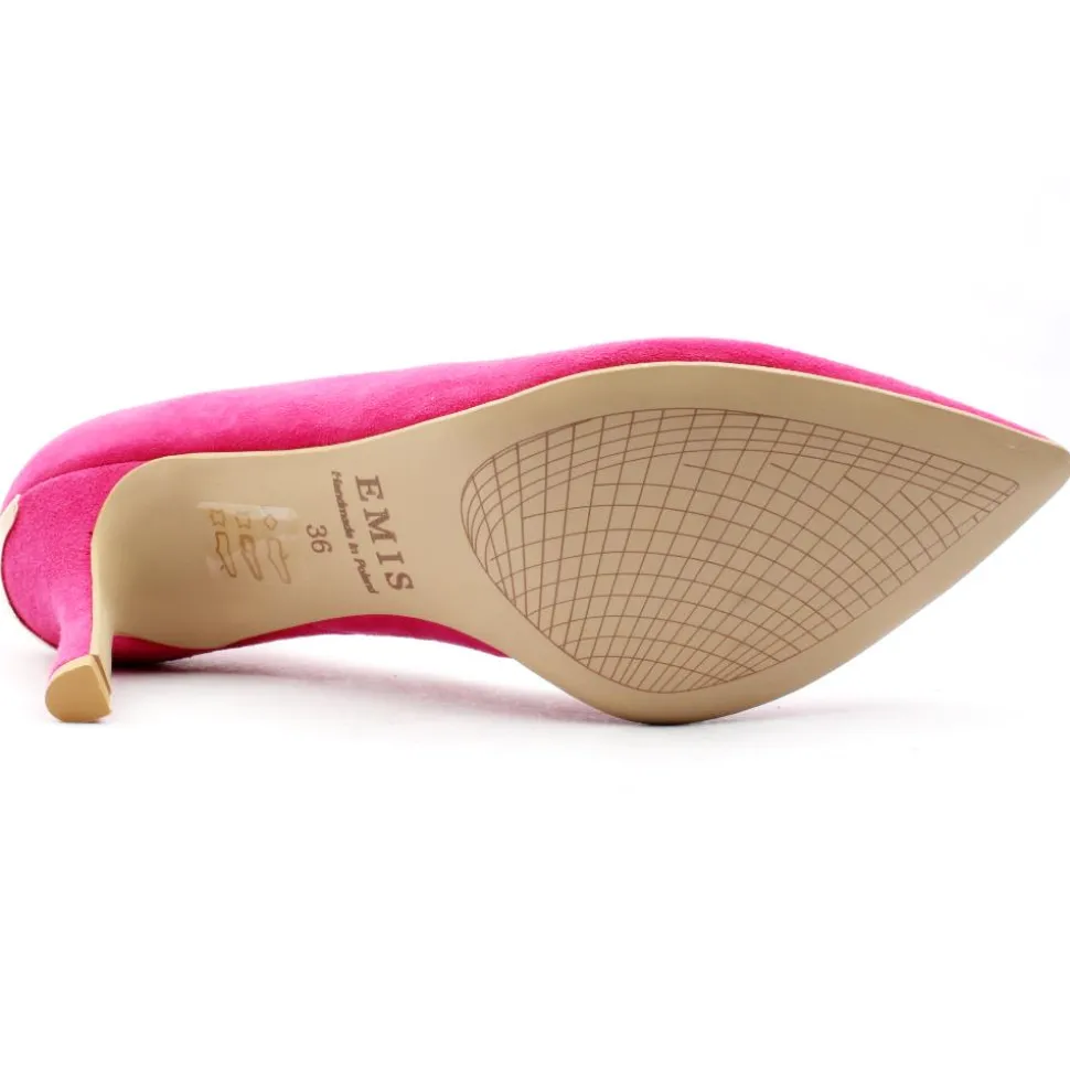 The Emis Shoe 8073 023 in fuchsia pink is a striking and sophisticated footwear choice. Crafted with a vibrant pink suede leather upper, this shoe exudes elegance and style. The pointed toe design of the shoe contributes to its sleek and contemporary look, enhancing the overall fashion-forward vibe. The attention to detail is evident with the gold rim at the top of the heel, a visually appealing contrast with the bold pink upper. This shoe is sure to capture attention with its bold colour, pointed toe, and subtle gold accent, making it a standout addition to any wardrobe.