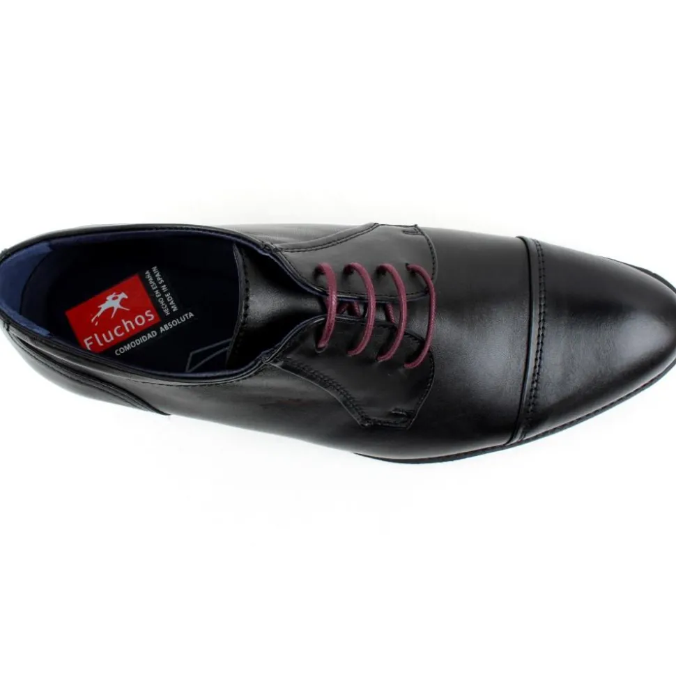 Formal mens shoes from Spanish shoe brand Fluchos Shoes. This shoe has a has a soft black leather upper with a contrasting burgundy lace closure. Designed with shock absorber built in technology in the sole to provide all day comfort. The cushioned insole is removable.