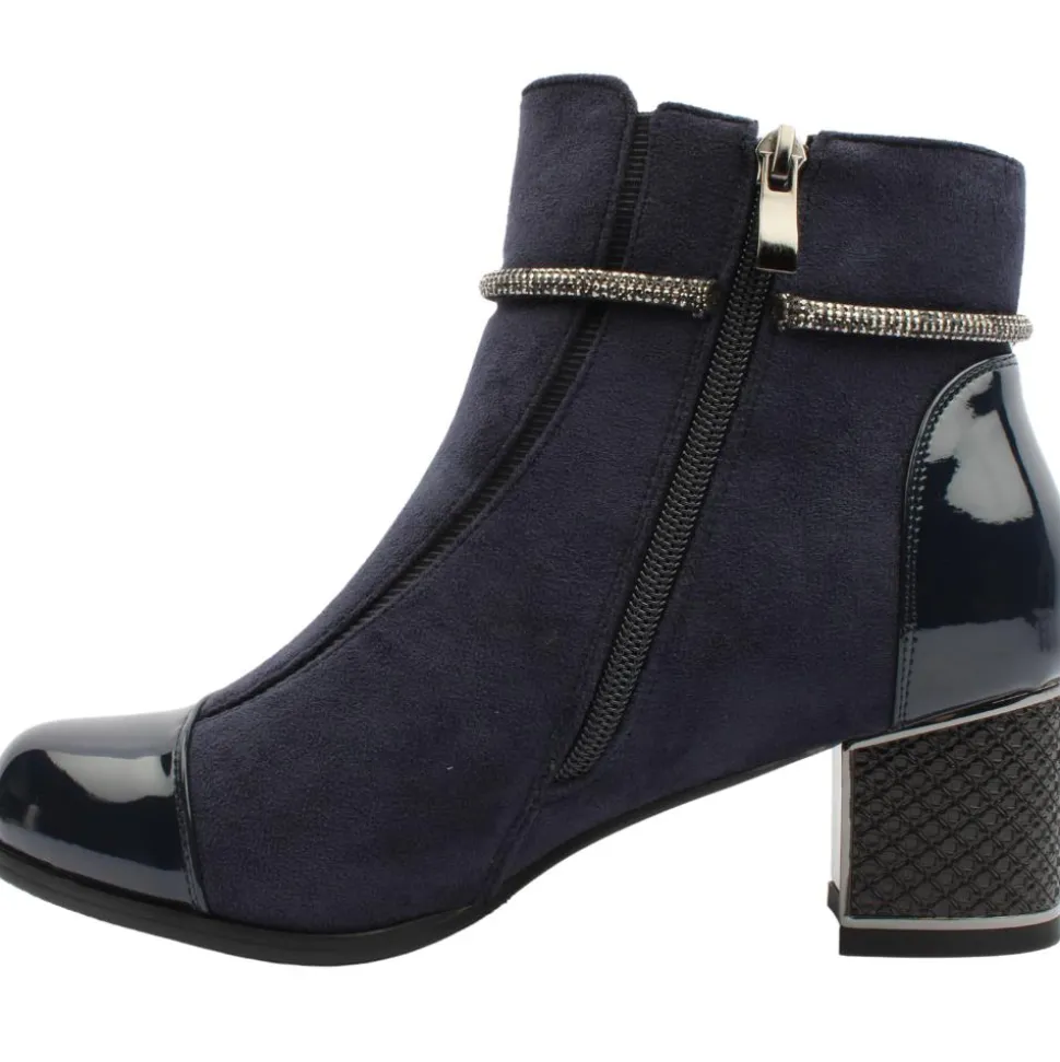 Stylish ankle boots from Redz Shoes.This low heeled dressy boot has a navy faux suede upper with a patent toe and textured heel. The chain detail adds to the dressy look of this style of these Redz boots. A great style with trousers and skirts/dresses.
