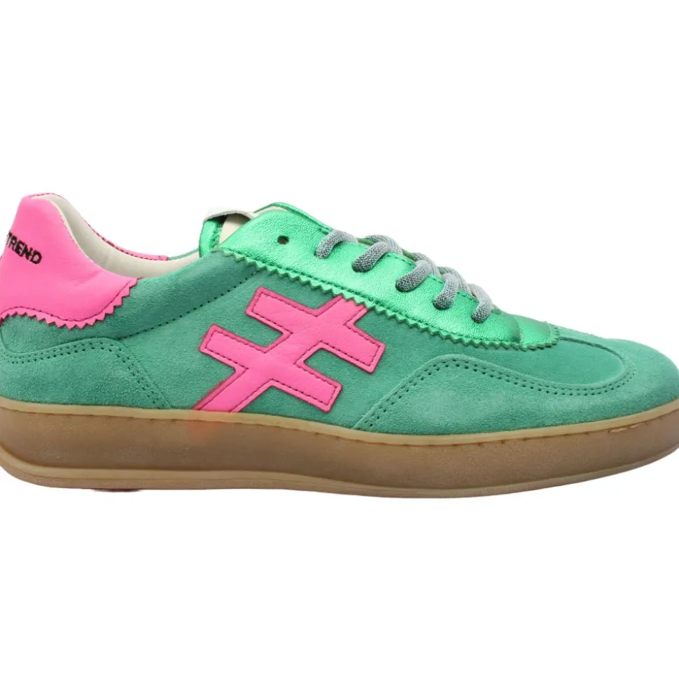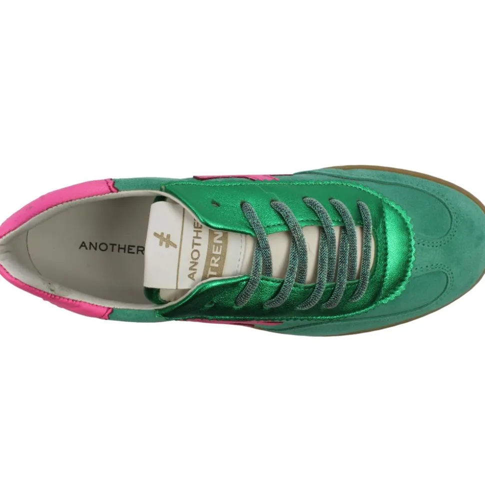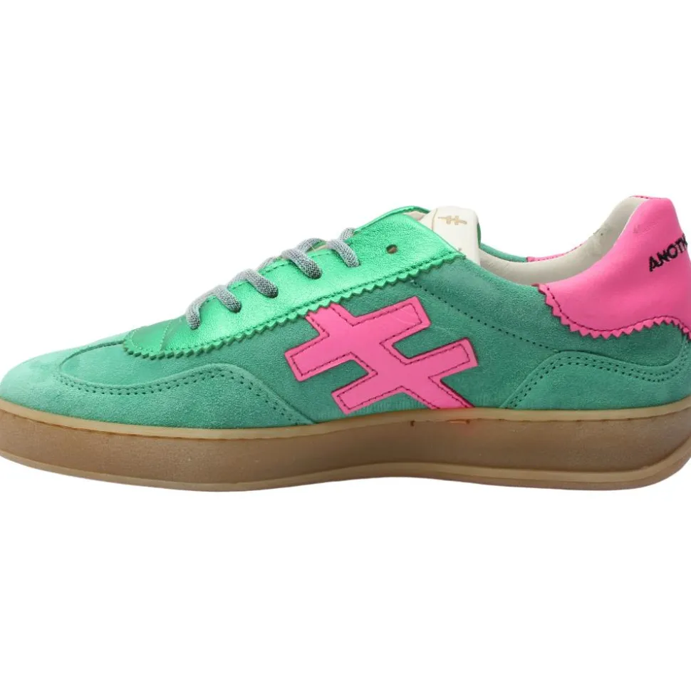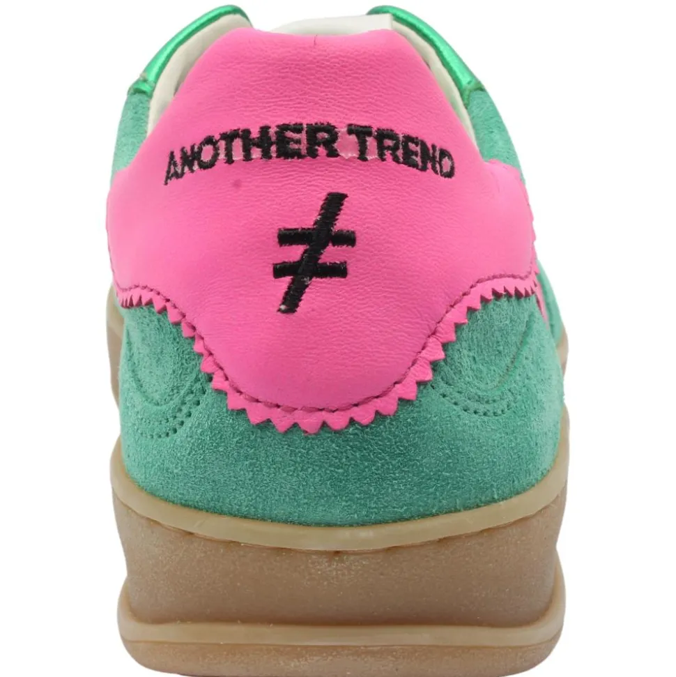 Womens shoes from Another Trend, model 032, showcases a stylish and unique combination of green and pink. This trendy design is complemented by a cushioned insole for added comfort and a gum outsole for durability. Perfect for pairing with black outfits, this trainer offers both fashion and function.