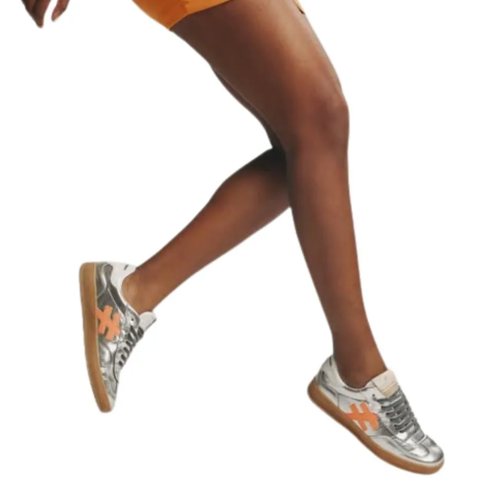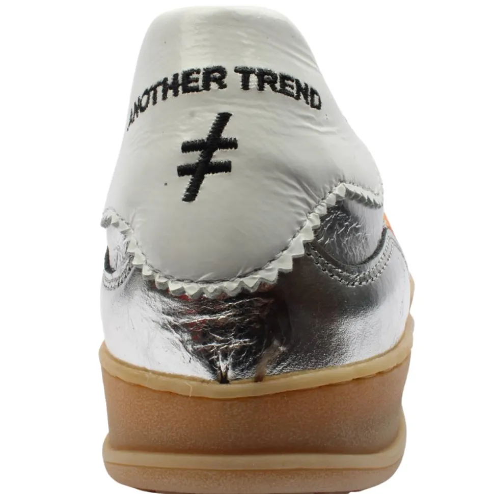 These ladies trainers from Another Trend shoes, model A032, showcases a stylish combination of silver with orange and white detailing .This trendy design is complemented by a cushioned insole for added comfort and a gum outsole for durability. Perfect for pairing with outfits, this trainer offers both fashion and function.