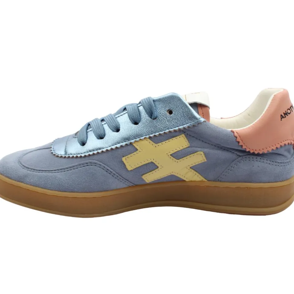 The Ladies Trainer from Another Trend, model A032, showcases a stylish combination of blue suede leather with yellow and peach detailing. This trendy design is complemented by a cushioned insole for added comfort and a gum outsole for durability. Perfect for pairing with black outfits, this trainer offers both fashion and function.