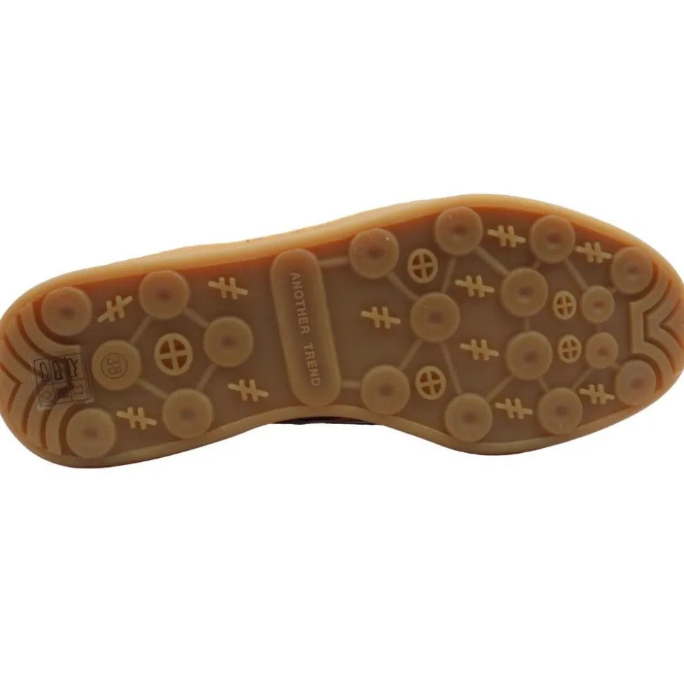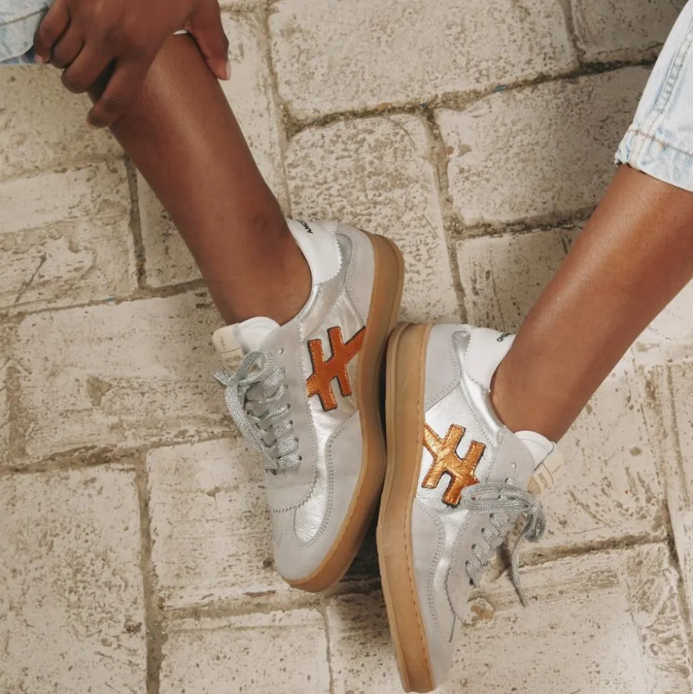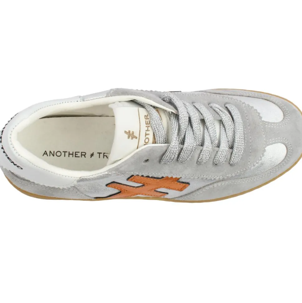 The Ladies Trainer from Another Trend, model A032, showcases a stylish combination of grey and silver leather with orange detailing. This trendy design is complemented by a cushioned insole for added comfort and a gum outsole for durability. Perfect for pairing with black outfits, this trainer offers both fashion and function.