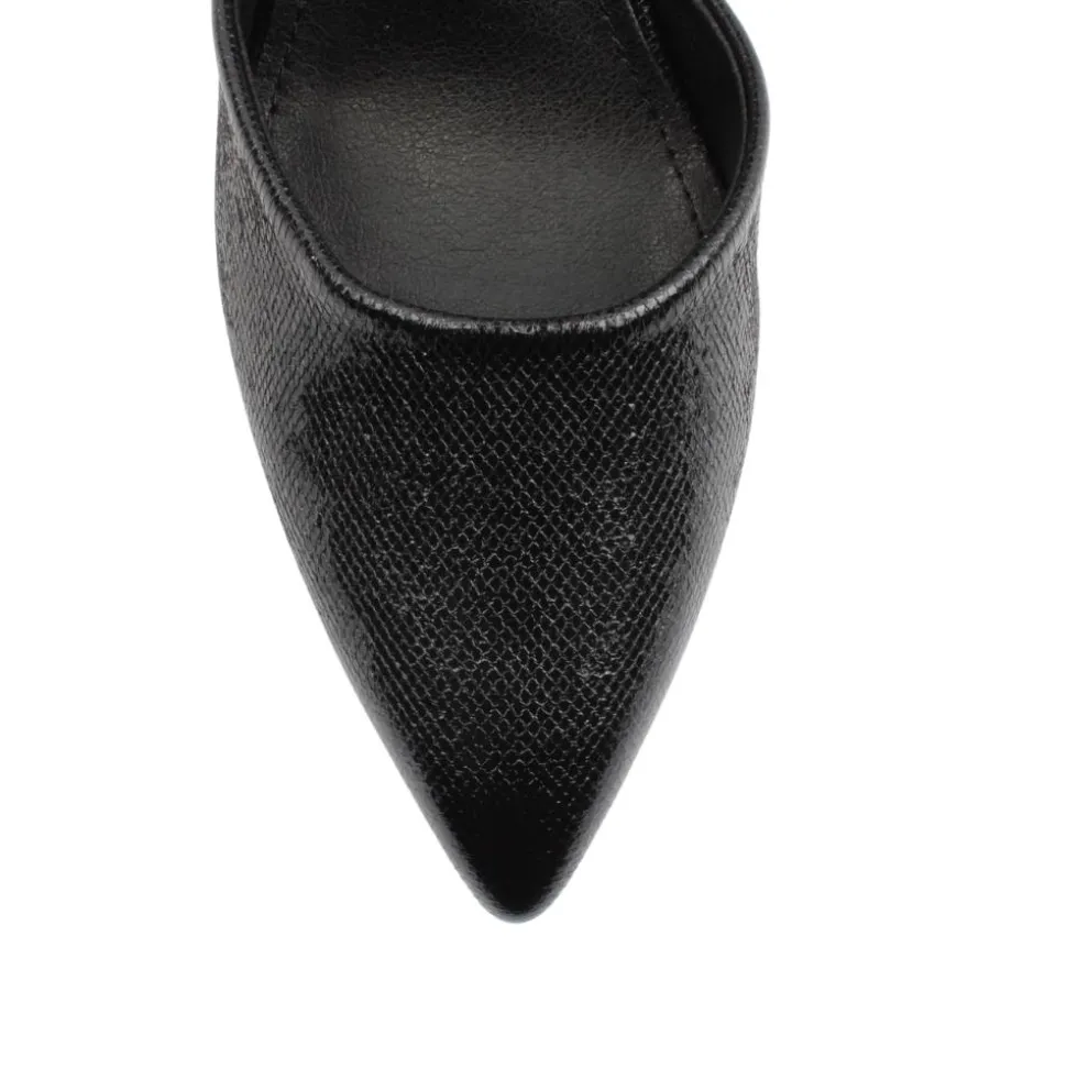 The Kate Appleby Appledore shoes features a chic and eye-catching design, perfect for special occasions or adding a touch of glamour to your outfit. These shoes have a black textured upper with shimmer effect, the straps are adorned with diamontes creating a glamorous and festive look.