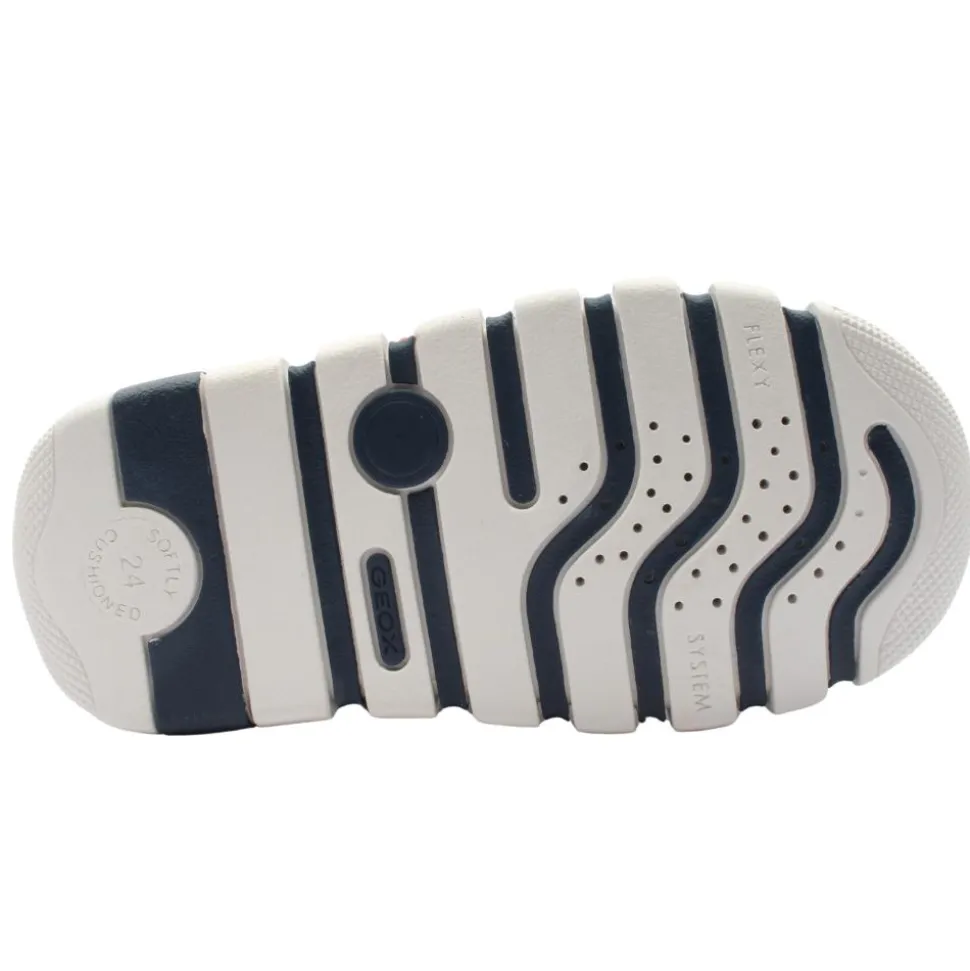 Stylish boys shoes from Geox shoes in a a soft navy/pistachio upper. The shoe has a removable, breathable leather insole that has a handy fit guide at the toe to ensure the perfect fit. Super soft heel cushioning & toe protectors adds to the comfort of the shoe.The double velcro strap allows for easy on/off.