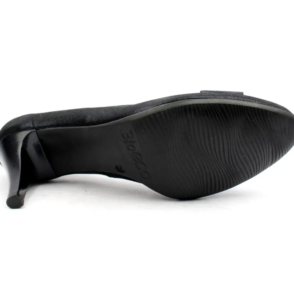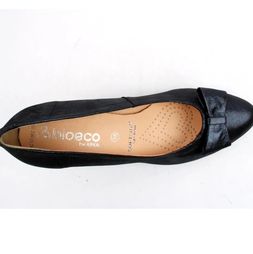 Ladies Court Shoe from Bioeco By Arka. Soft Navy Sheen Leather upper with rounded toe and simple bow. Softstep cushioned insole for all day comfort.
