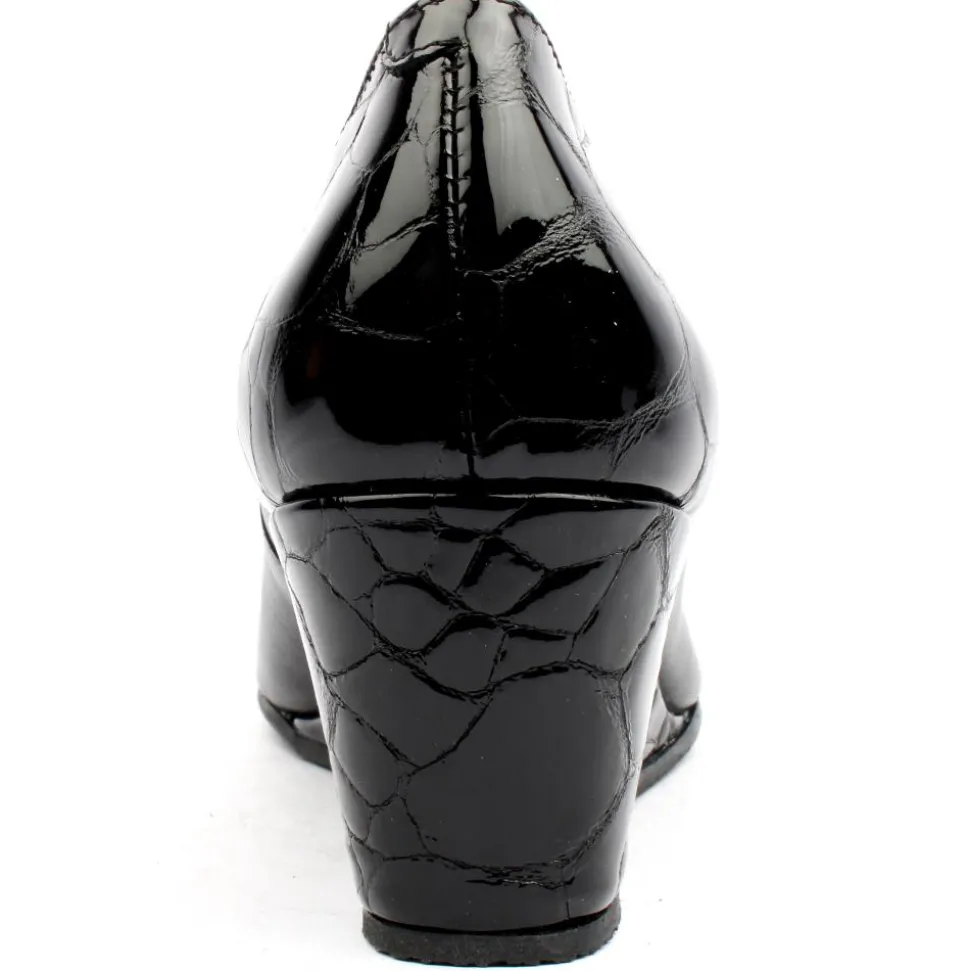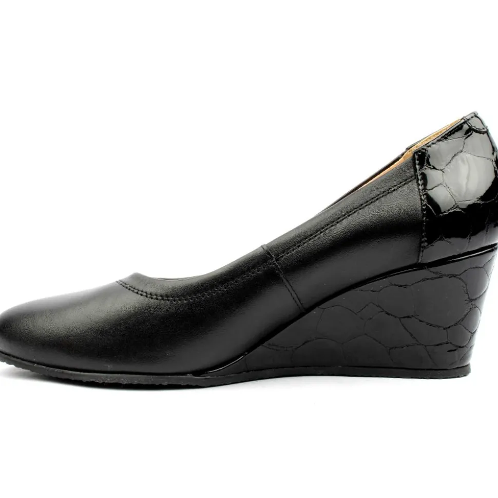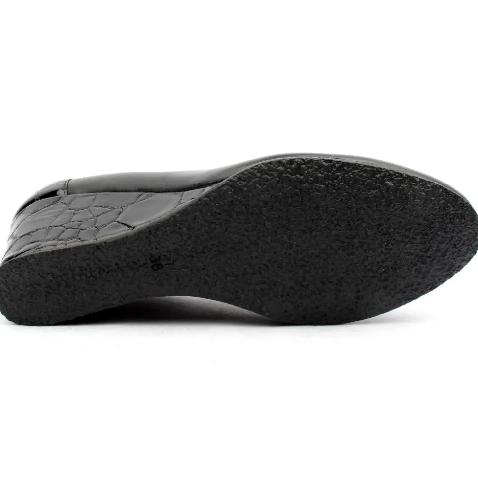 Ladies wedge shoes from Bioeco by Arka. These Ladies Shoes have a soft leather upper with black croc detailing on heel and on wedge, They have a cushioned softstep system insole for all day comfort.