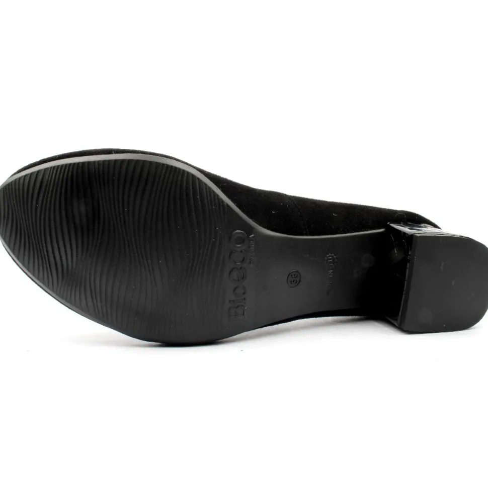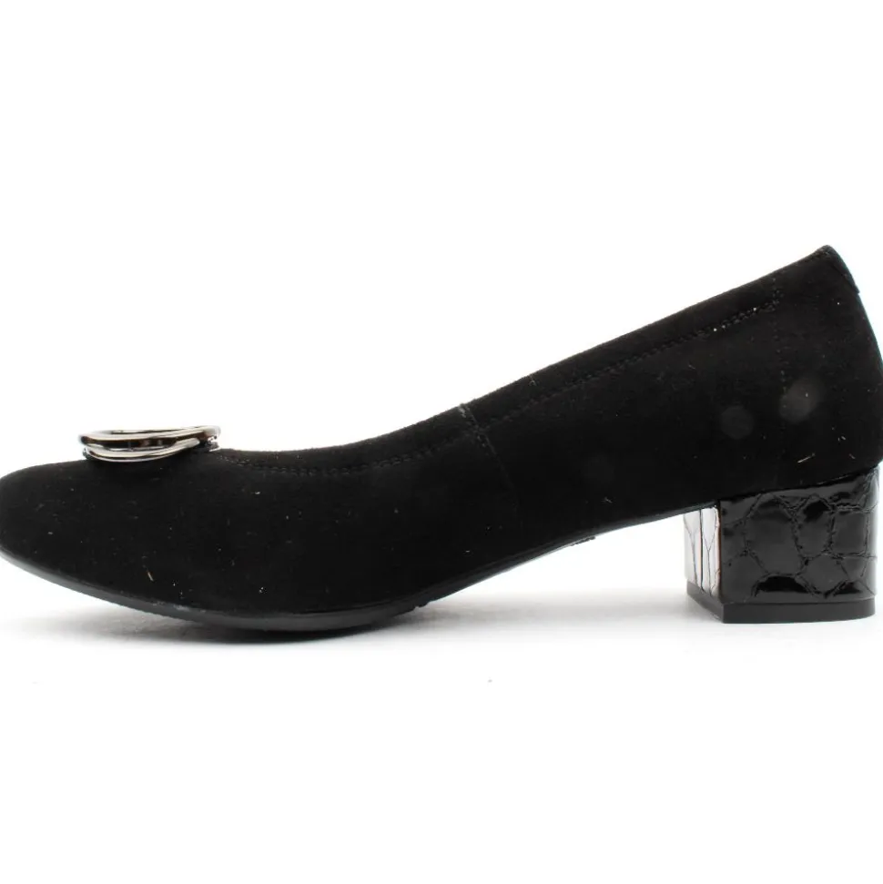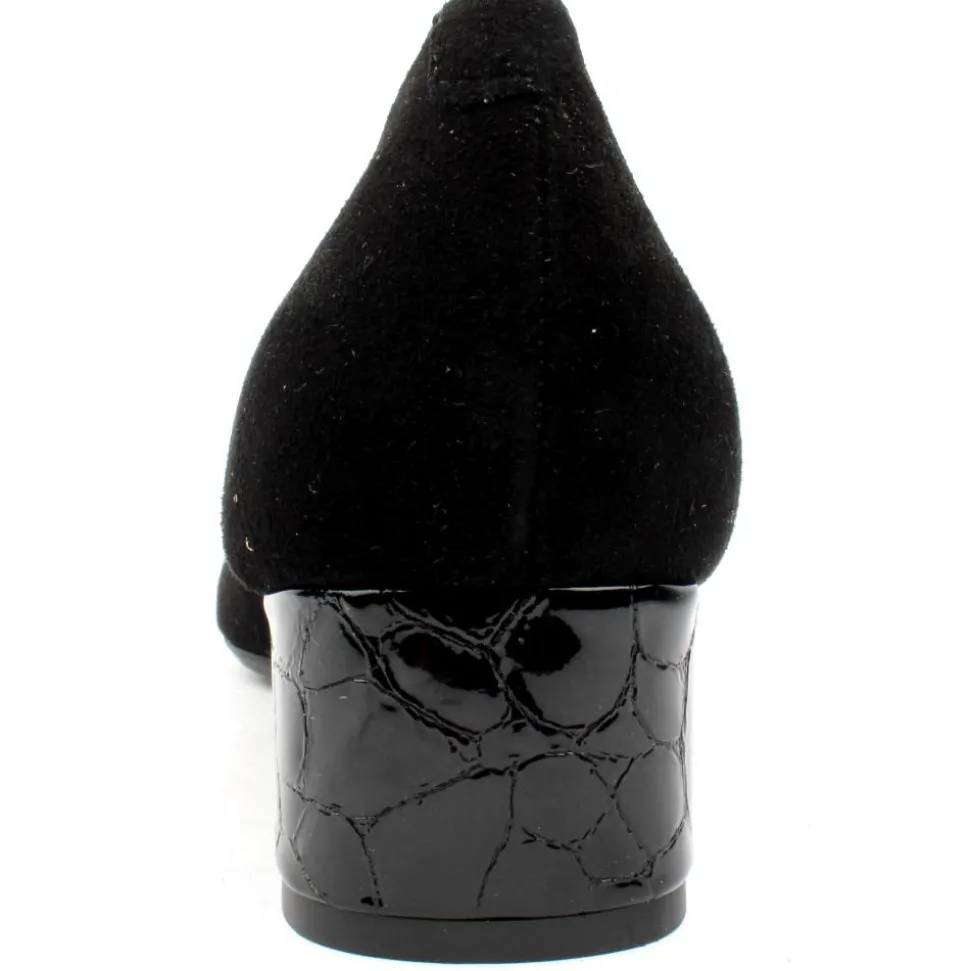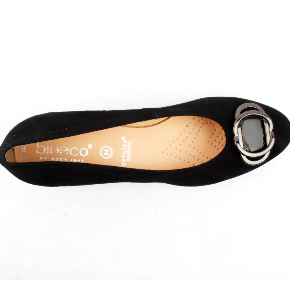 A classic wide fitting block heel court shoe from Bioeco by Arka Shoes. These shoes have a lovely soft black suede upper with a pewter brooch at the toe. It has a breathable cushioned leather insole with a Softstep system. This style is a extra wide H fitting shoe.