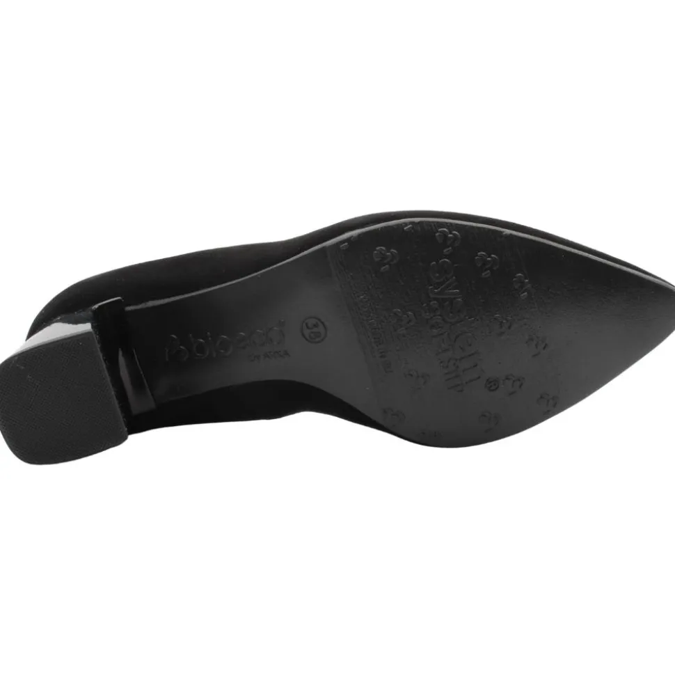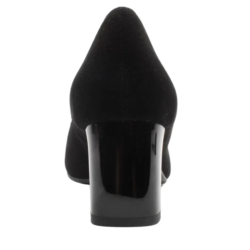 A classic block heel court shoe from Bioeco by Arka Shoes. These shoes are designed using a soft black suede upper with a small gold accent and a block heel. It has a breathable cushioned leather insole with a Softstep system which adds to the comfort of the shoe.