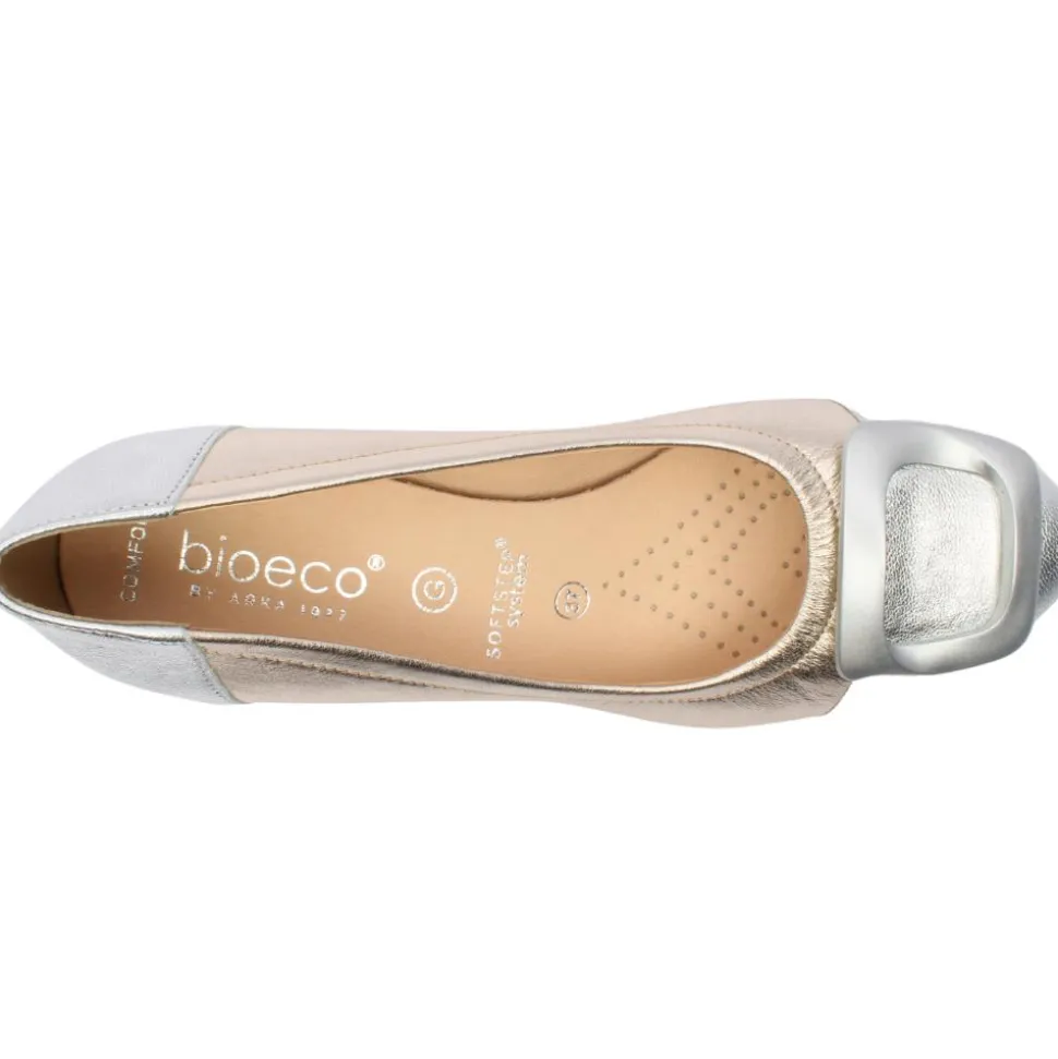 Experience elegance and comfort the Bioeco by Arka Ladies shoes style 6631. This stylish shoe features a sophisticated blend of metallic silver and gold leathers, making it a standout addition to any wardrobe.The unique square design on the toe enhances the shoe’s contemporary aesthetic.The sturdy block heel provides stability and support, making these shoes ideal for all long wearing for special occasion days. Experience superior comfort with the Bioeco by Arka Softstep cushioned system, designed to provide optimal support and cushioning for your feet.