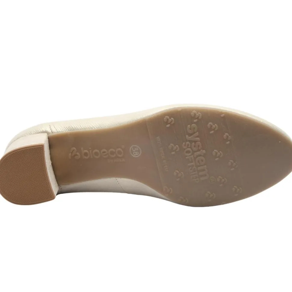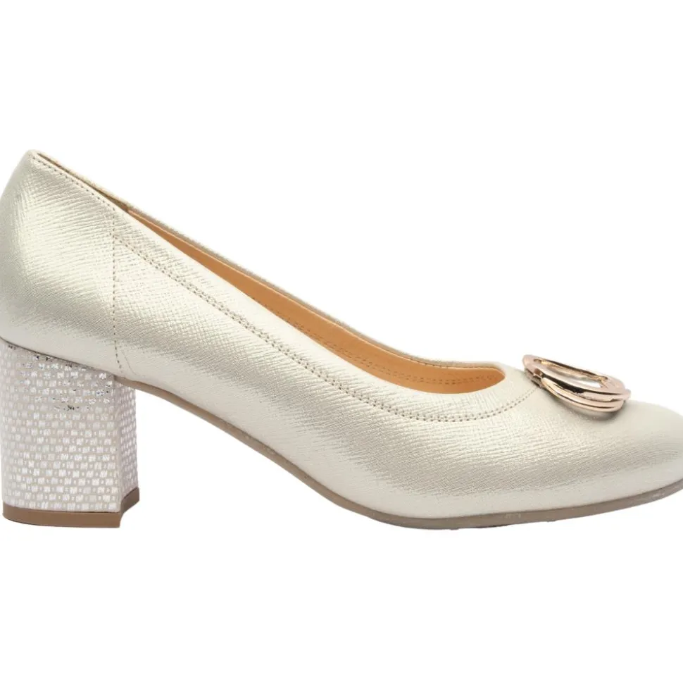 Stylish Bioeco by Arka Court shoes, in gold shimmer leather upper with gorgeous brooch design These dressy shoes are a perfect fusion of comfort and style. Featuring the innovative Bioeco By Arka Soft Step System, which provides an unparalleled comfort experience. D esigned with a H extra wide fit, these shoes cater to those seeking both style and roomy comfort. The block heel & leather insole add to the comfort of the shoe. The spacious design ensures that your feet have the freedom they need, making these shoes an excellent choice for all-day wear without compromising on elegance.