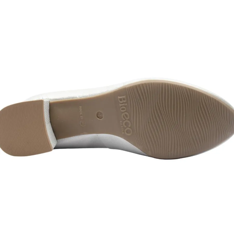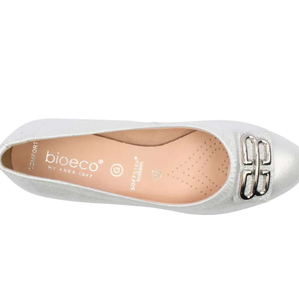 Stylish low heeled court shoes from Bioeco By Arka shoes in a silver leather upper with brooch detail.The low block heel provides stability and support, making these shoes ideal for, long wearing on special occasion days. Experience superior comfort with the Bioeco by Arka Softstep cushioned system, designed to provide optimal support and cushioning for your feet. Designed with a G wide fit, these shoes cater to those seeking both style and roomy comfort.