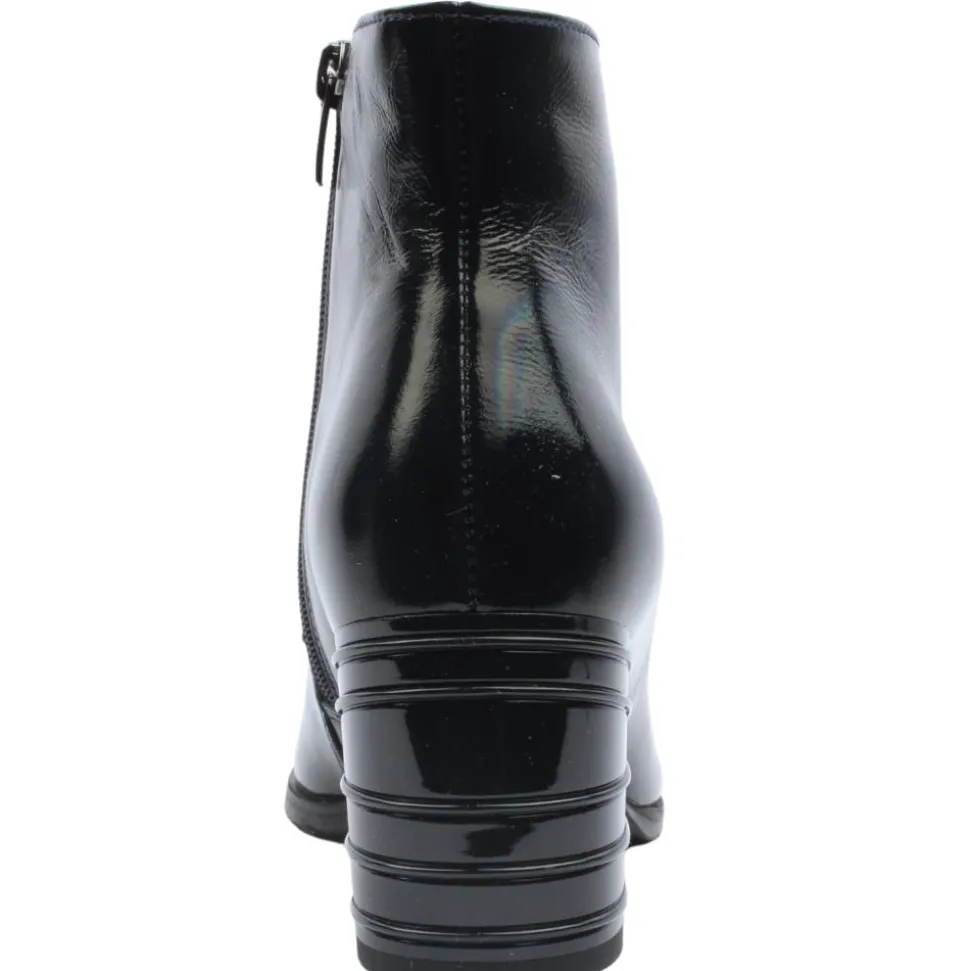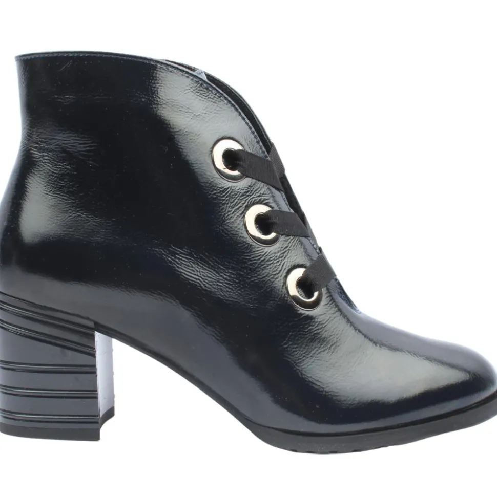 Ladies ankle boots from Bioeco shoes by Arka. This stunning patent boot has a patent upper with a ribbon lace. The heel is low to keep you comfortable and perfect for an everyday boot. This boot has a unique 3-D effect on the heel to add some style.